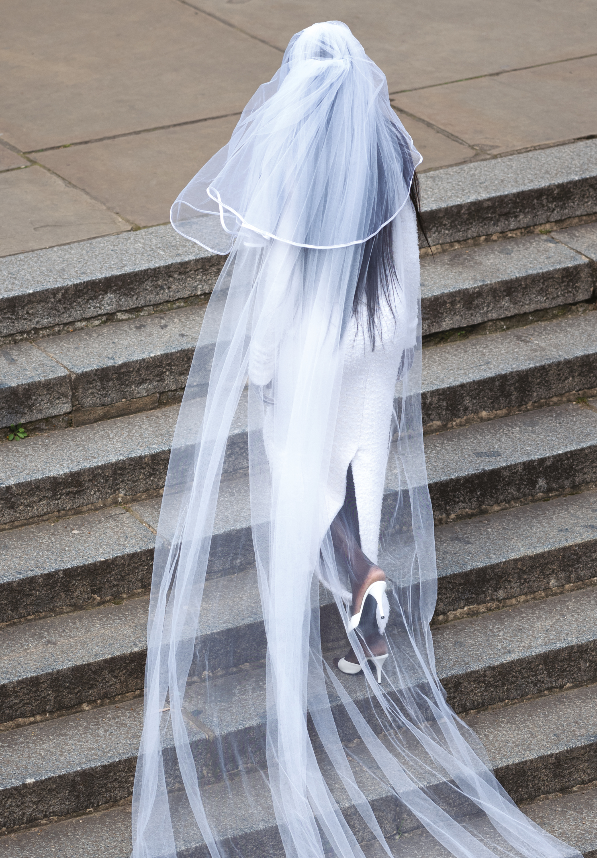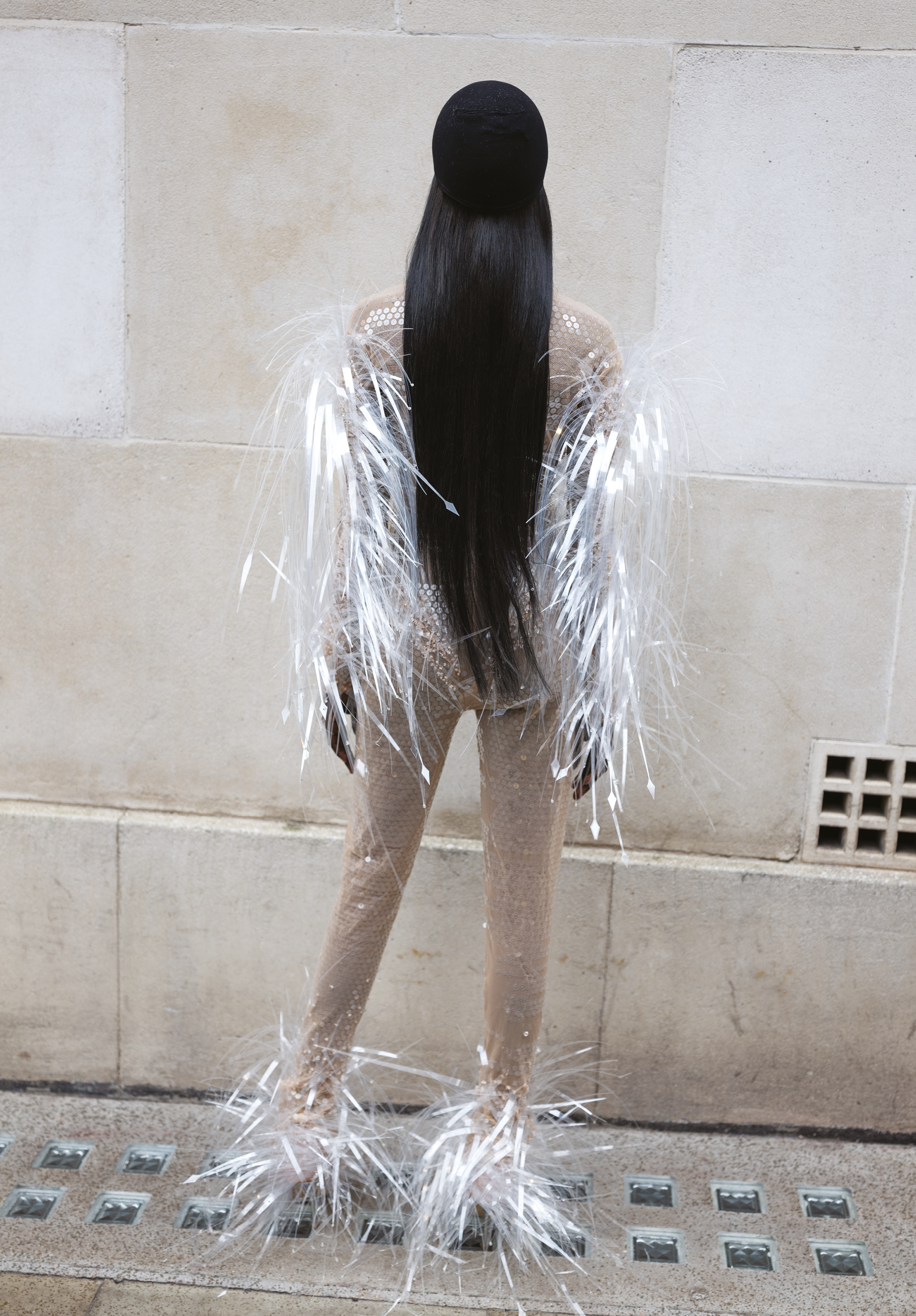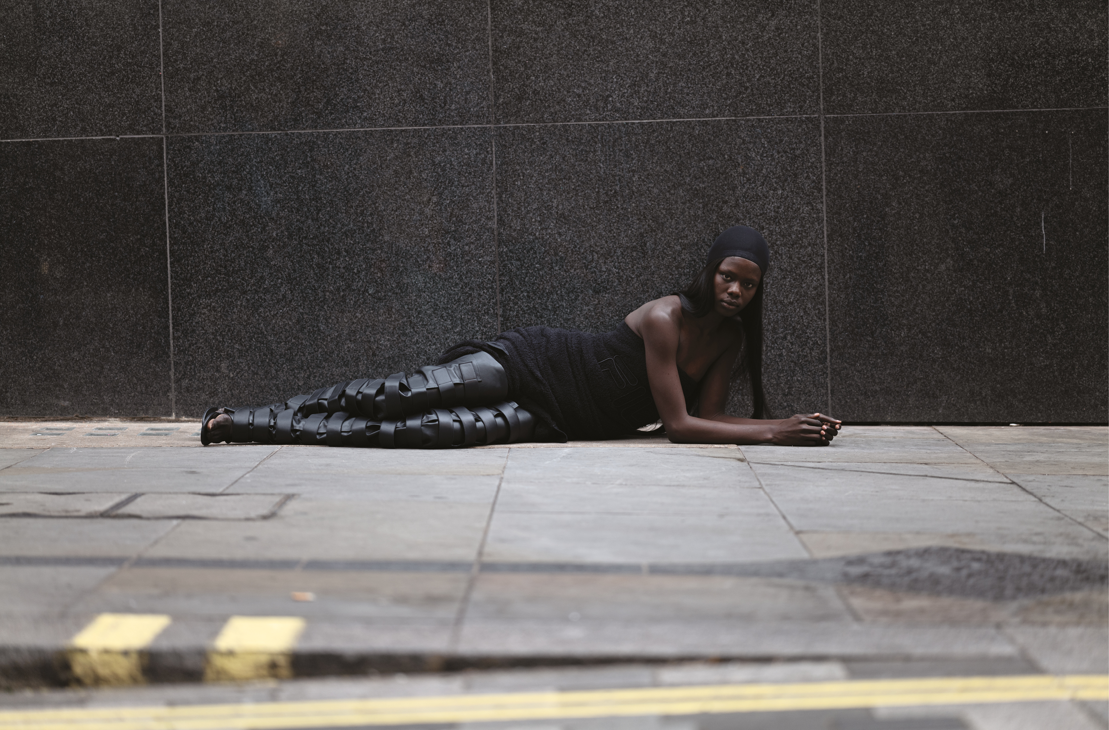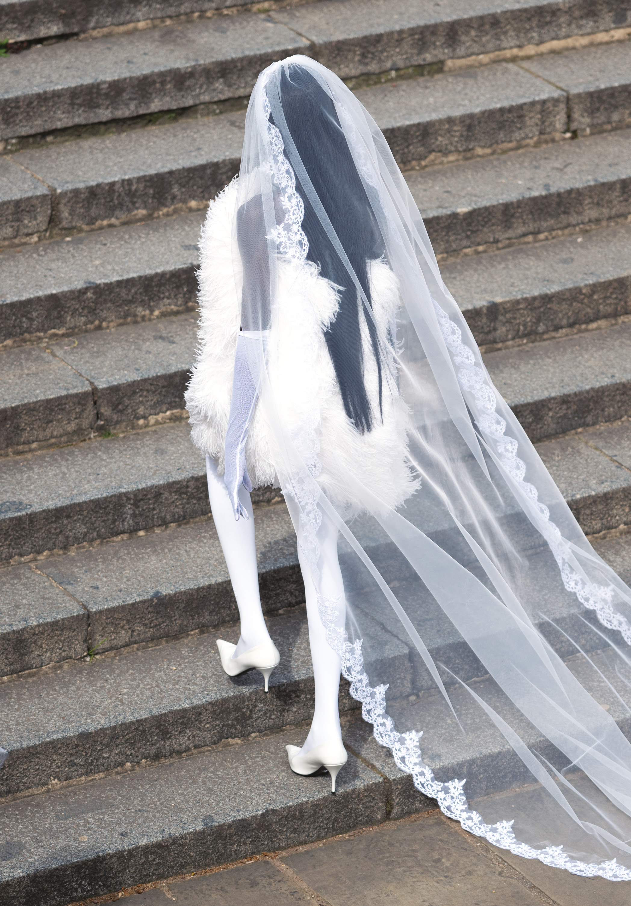 Akolde wears jacket and skirt BALENCIAGA, shoes WE11DONE, gloves DENTS and veil stylist’s own