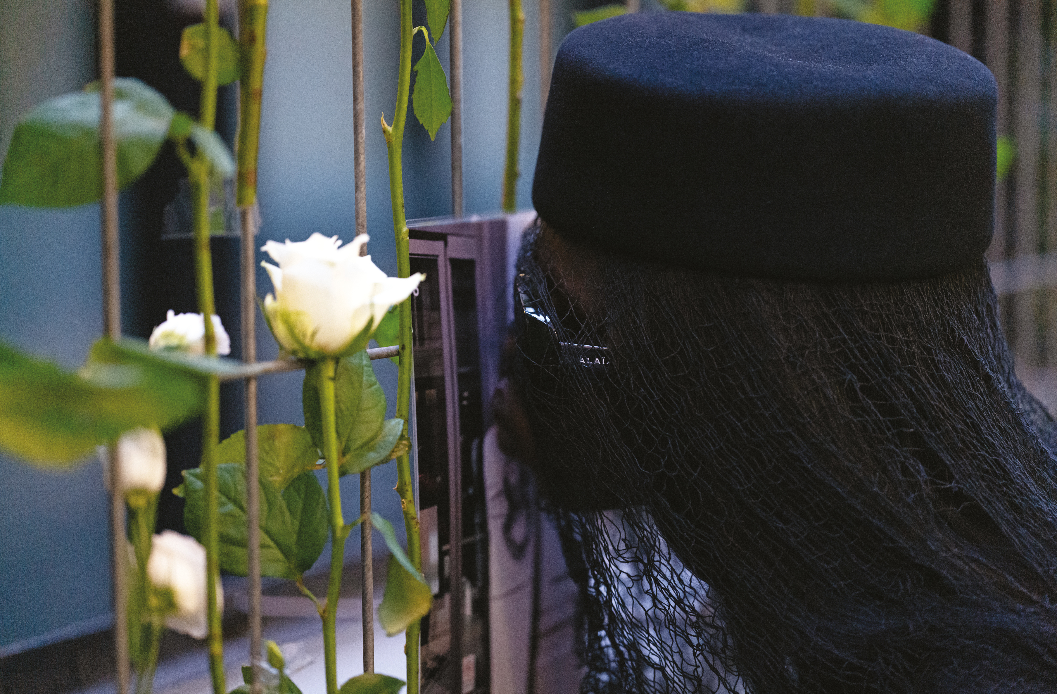 Piath wears jacket, hat and sunglasses ALAÏA and veil stylist’s own