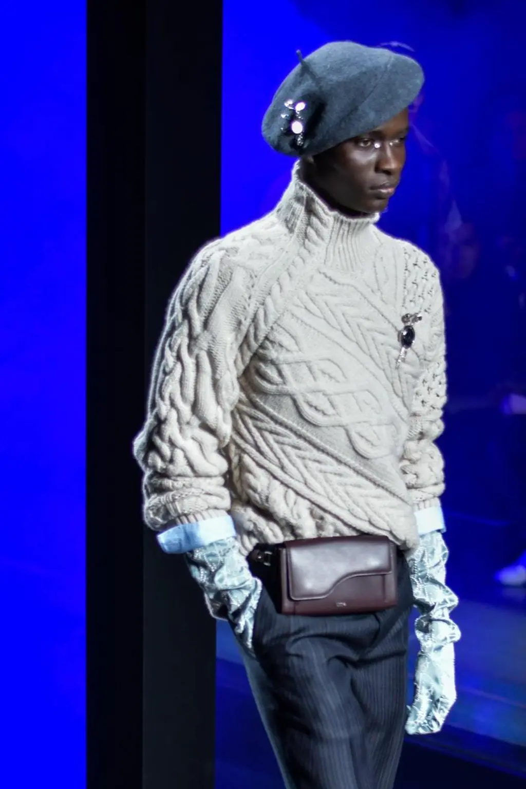 At Loewe, Jonathan Anderson also had couture on his mind. A trio of ruched, sheeny dresses were the result of a mash-up of two references: 1950s couture gowns and a dreamt up or, perhaps, familiar scenario in which young boys are holding dresses up against themselves in the mirror. As a result of the latter, said dresses were left completely open at the back and fastened like aprons. Anderson said the collection was a fantasy wardrobe. Other couture-inspired pieces within that wardrobe included exquisite coats that took on slick Princess-line silhouettes. Elsewhere, candy-coloured cable-knit sweaters were festooned with more eye-catching jewels.