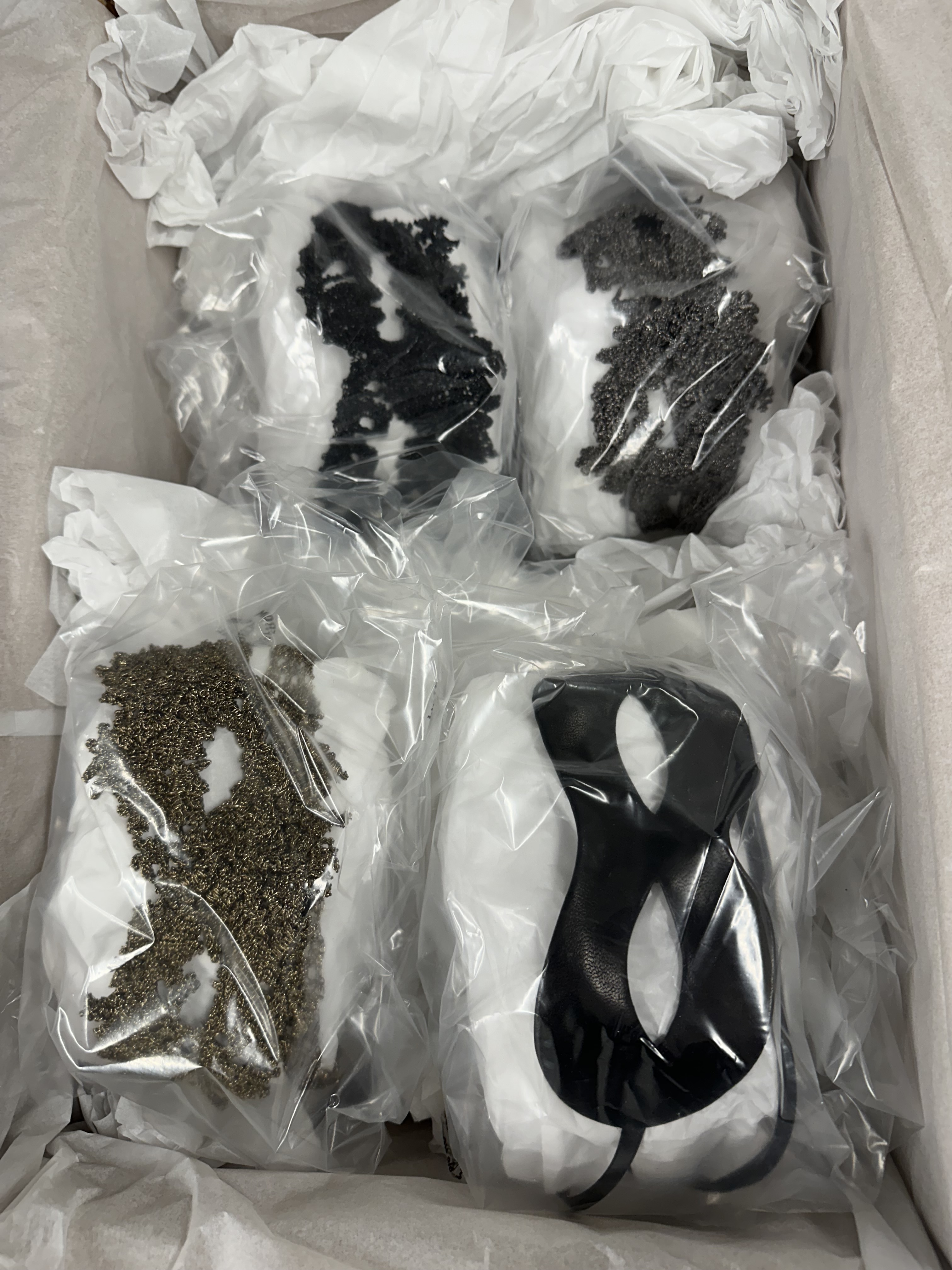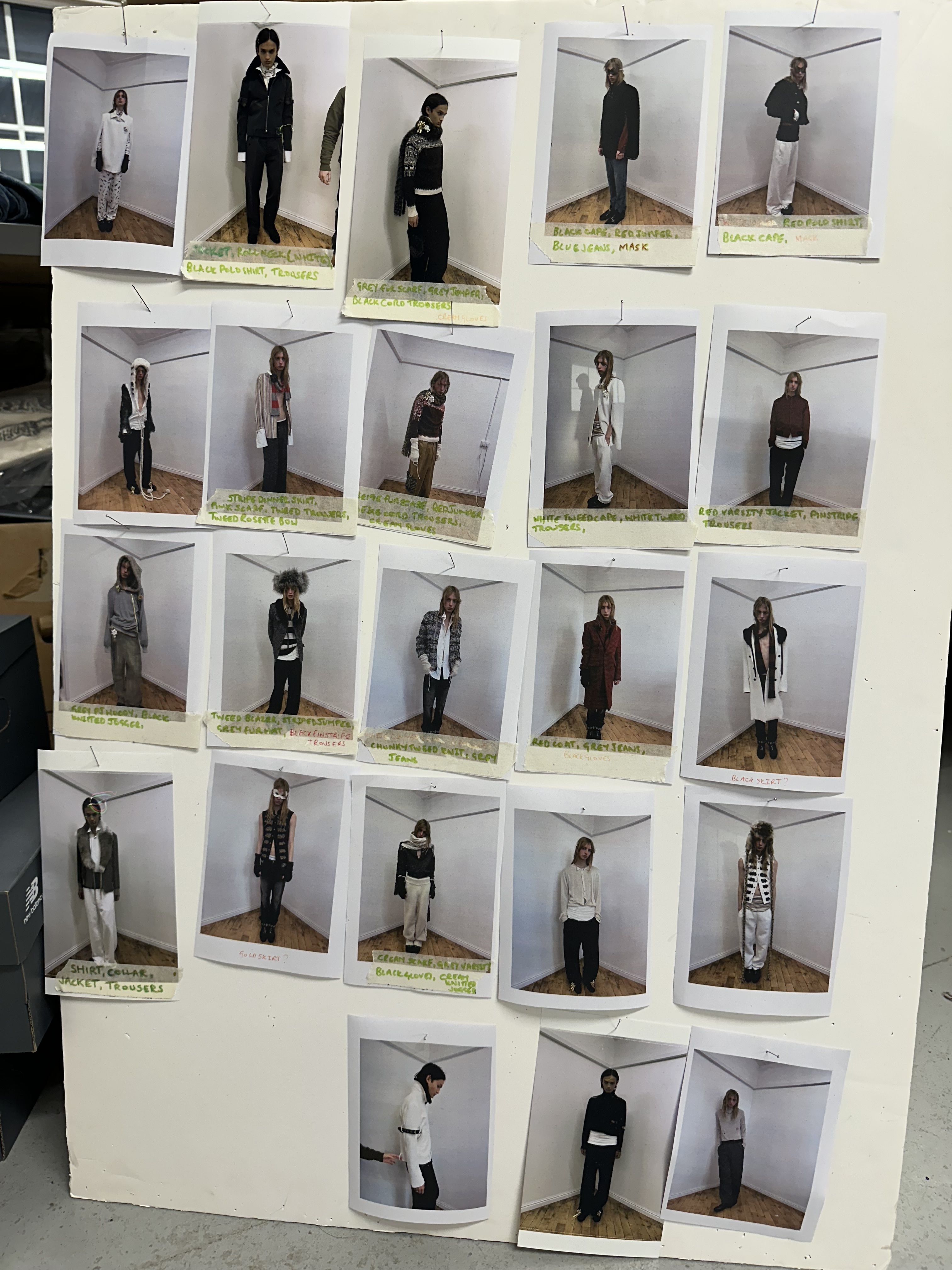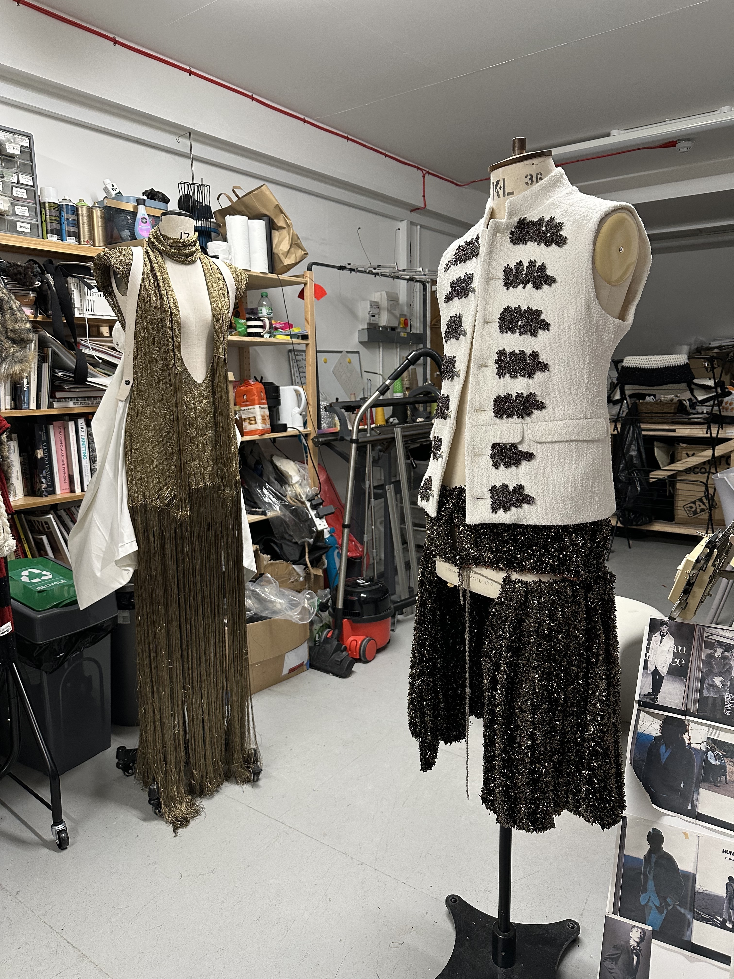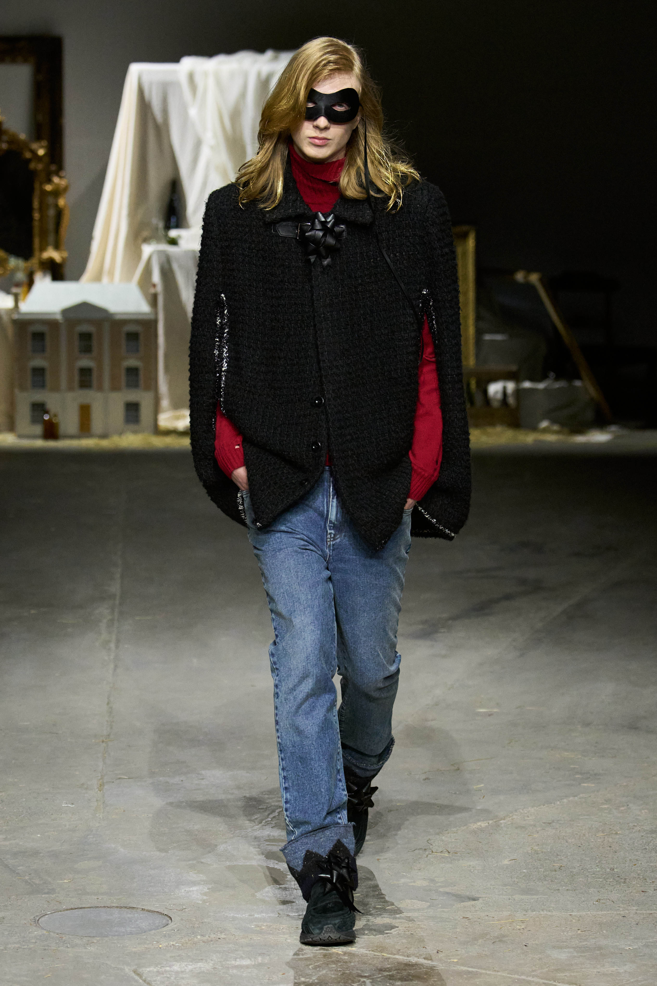 For the show, explains Oscar, models will wear masks designed in collaboration with milliner Noel Stewart (handily, he’s in the same studio block) – some fitted with reindeer horns. The idea was conceived by stylist Jack Collins, who has been consulting for Oscar for three seasons. “The styling feels grown-up and undone at the same time,” Collins tells me over Instagram DM, noting the blend of pyjama-style pieces coupled with more refined suiting and bouclé. “Maybe you picked up the wrong coat or someone else’s scarf when you were leaving,” he adds.