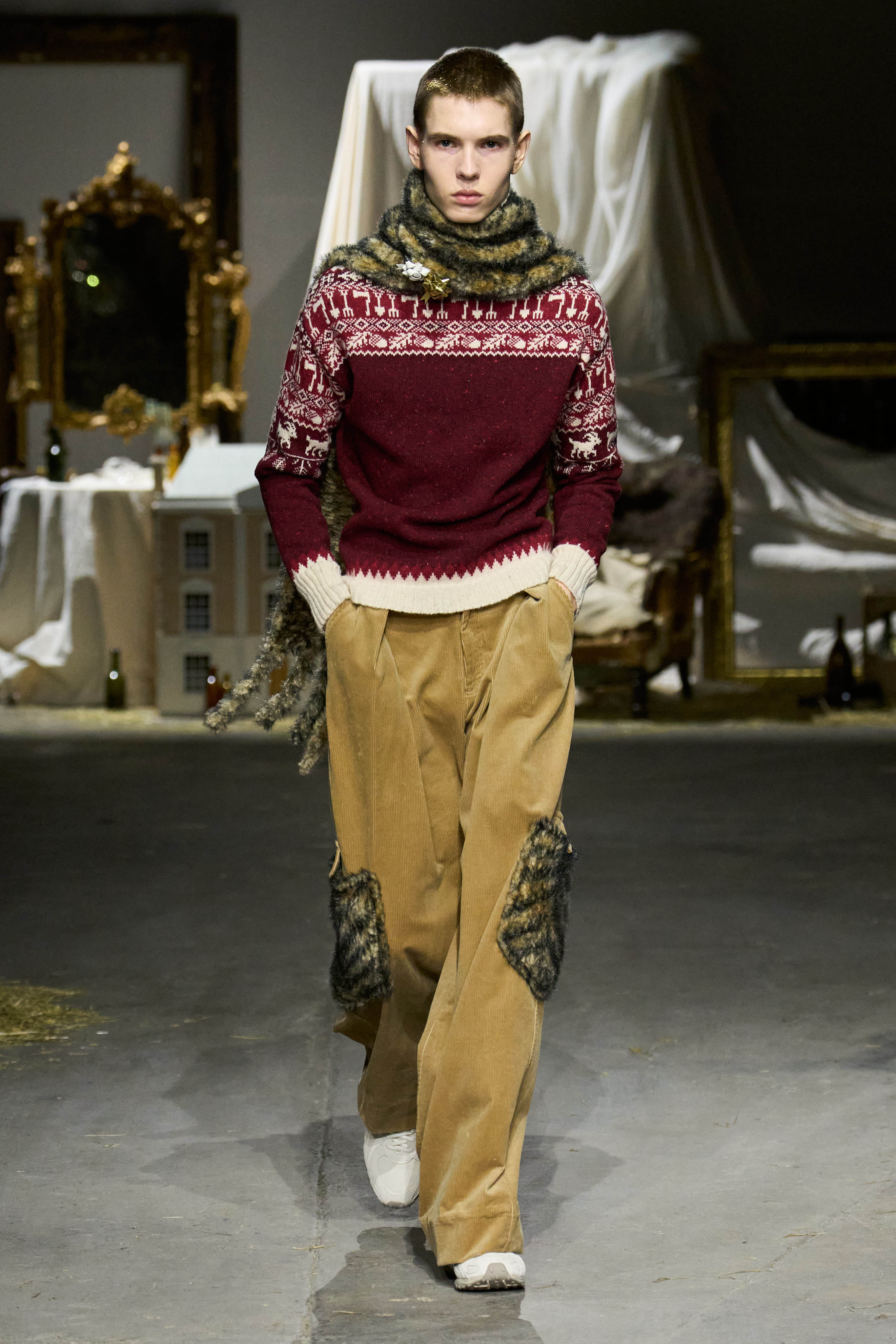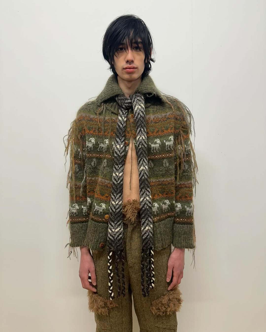Oscar, a business-savvy mind, has already showcased his designs to the buyers in Paris last month. As such, the collection was ready for factory production by November last year. The early deadlines have meant that the remainder of the team’s time has gone towards editing the looks and nailing the casting – “cute boys is the baseline”. He hands me a lookbook: models pose in fluff-tufted corduroys and Fair Isle varsity jackets. “I could see an east London gay wearing this one,” he says, pointing to a cropped shearling.