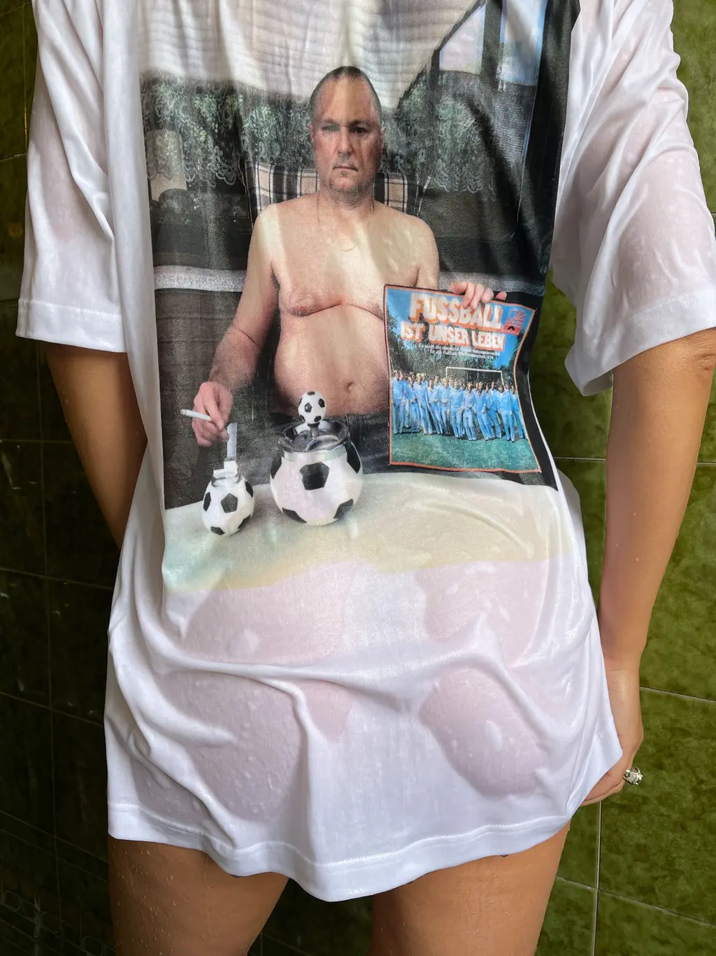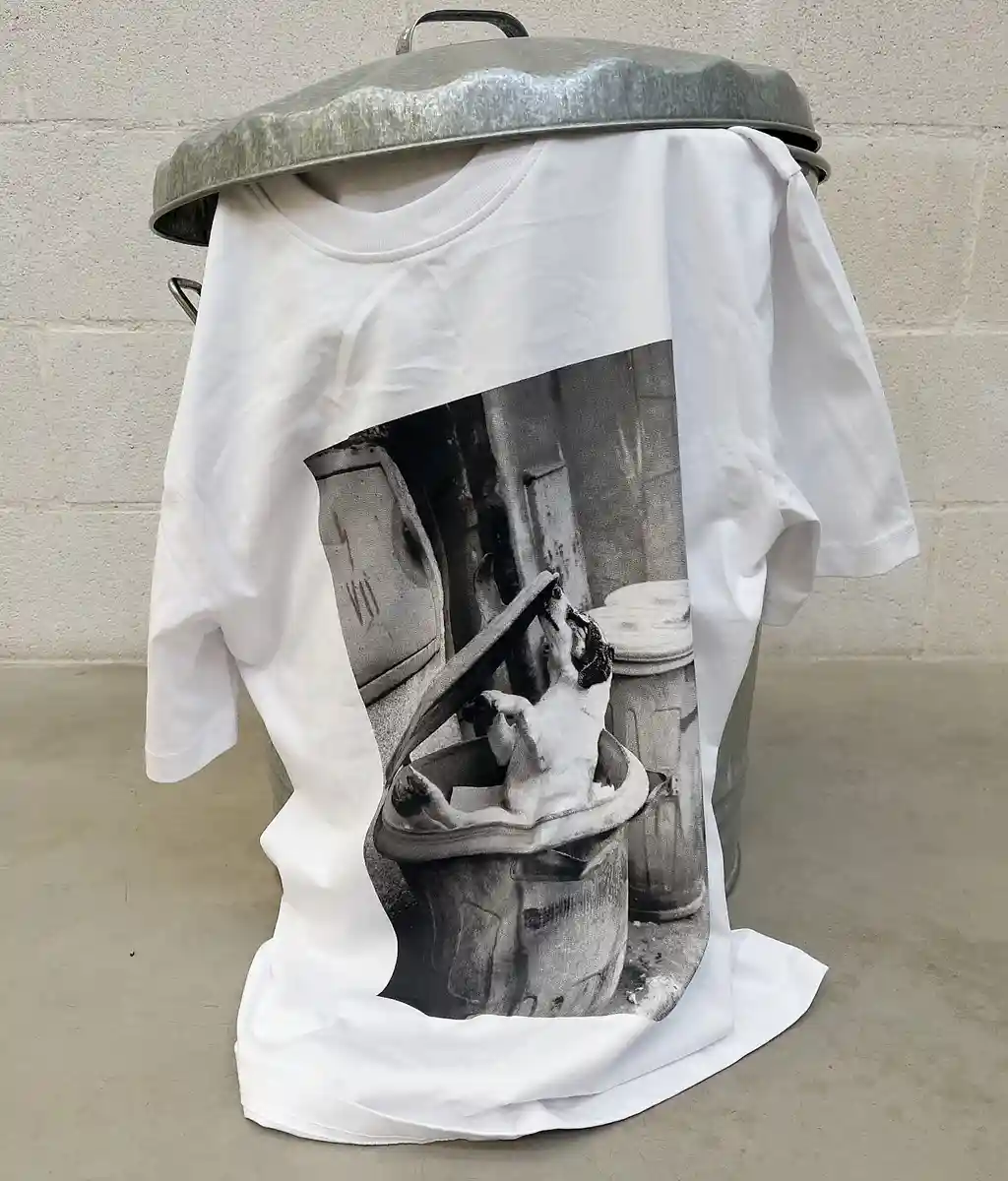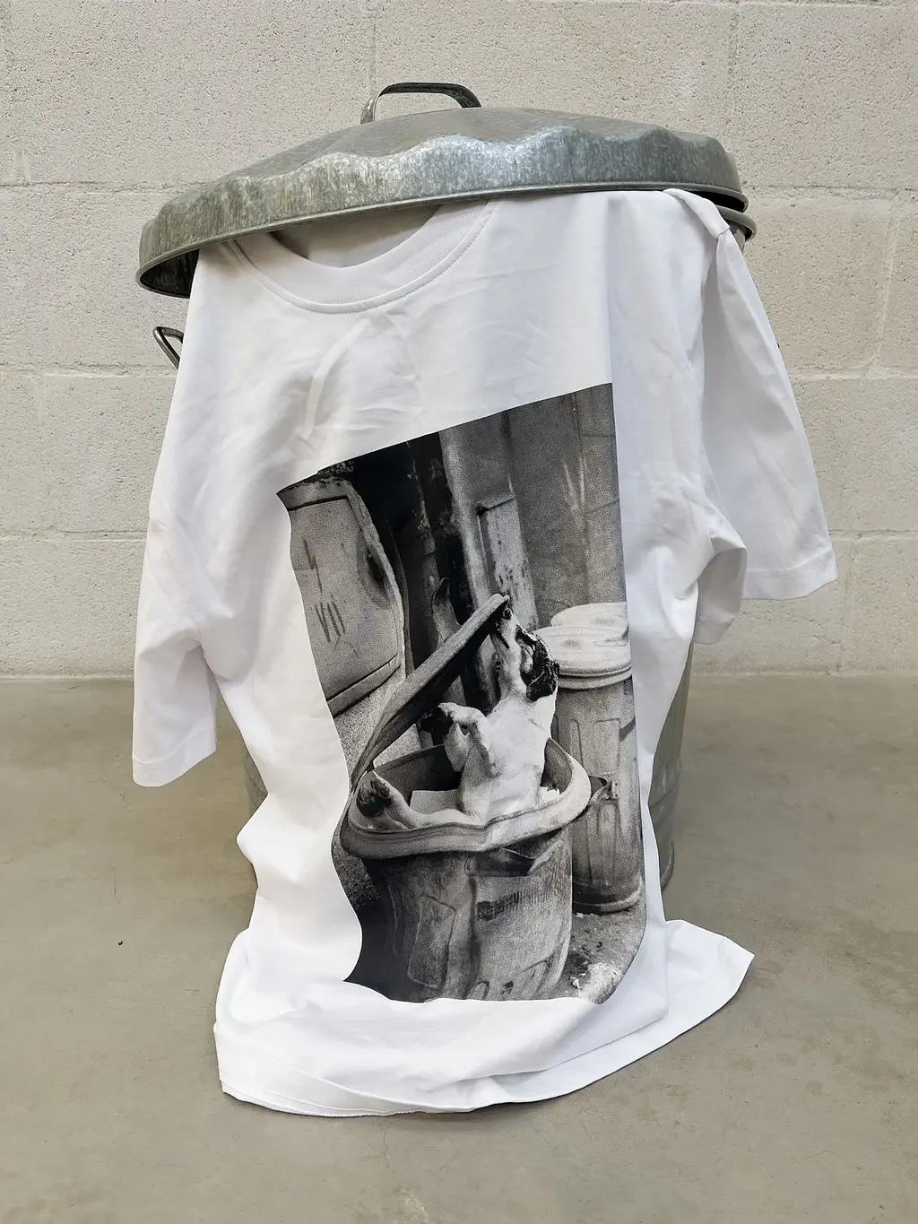 The duo’s latest drop, launching 9th July, features reimagined Tri-Ferg logos, playful handwriting scribbled onto tees and some of Teller’s most recognisable images emblazoned across entire garments. These include a frozen dead dog in a bin (!) taken in ‘90s Czechoslovakia, where Teller travelled after his father’s death, as well as a steamy image of cult model Kristen McMenamy from a cover shoot for Süddeutsche Zeitung Magazin.