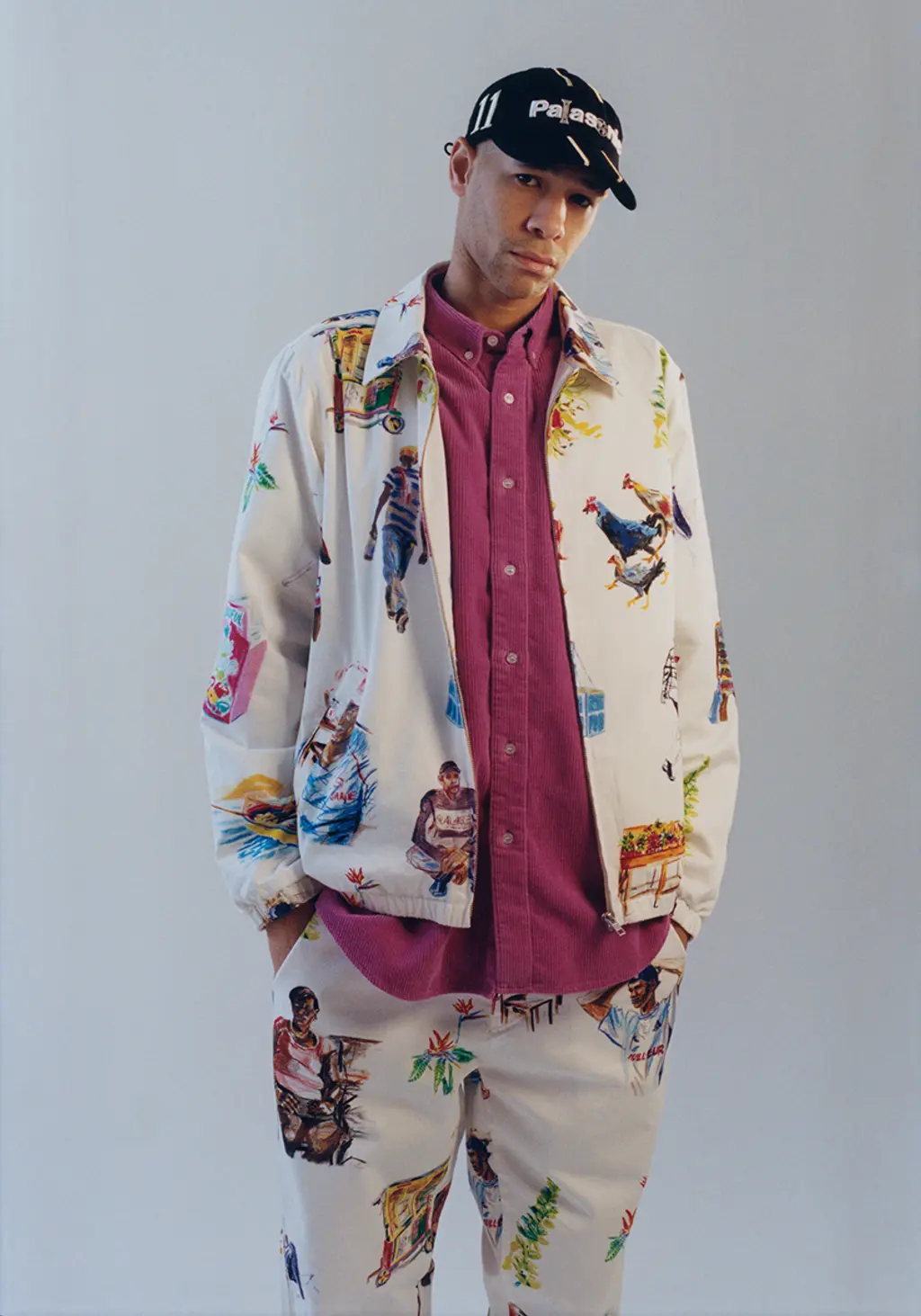 A fuchsia corduroy co-ord and a summery, cream jacket and trouser set boasting illustrations of the Palace guys are a call to arms for a Great British Summer, with the addition of a new mascot: a pigeon, which sits calmly on scouse skater Charlie Birch’s shoulder, and features on a couple of caps and sweatshirts.
