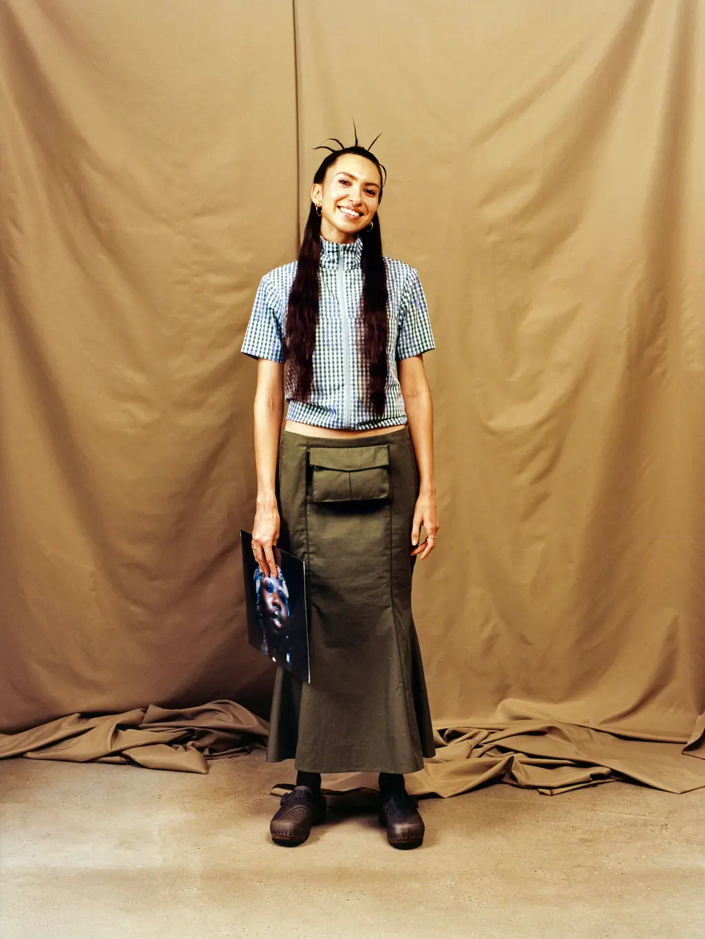 The clothes were suitably relaxed, too. While Farzaneh’s previous collections have adopted layers, heavy prints and deep, dark shades, this was somewhat pared down. Fabrics were light, using water-resistant cotton on a tartan shirt with paisley-print embroidery and a bright white waffle-print on skirts. Outerwear was notably absent from Farzaneh’s global warming narrative, but the one jacket was all about utility – hooded, pocketed and waterproof in cerulean. The colour palette was earthy, with trousers in olive green and sandy tones, interspersed with the occasional shock of lime green and red on a sweater vest.