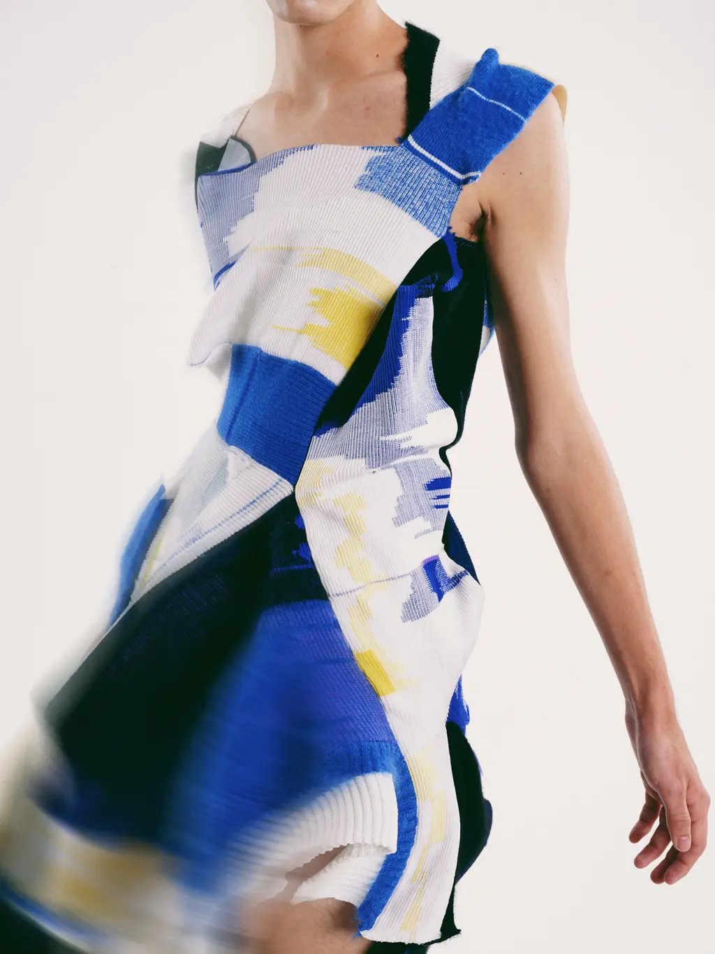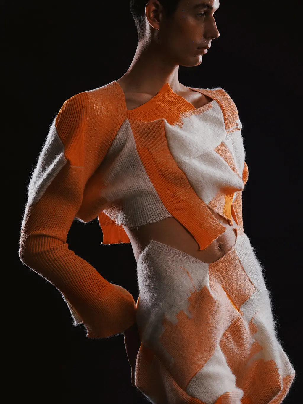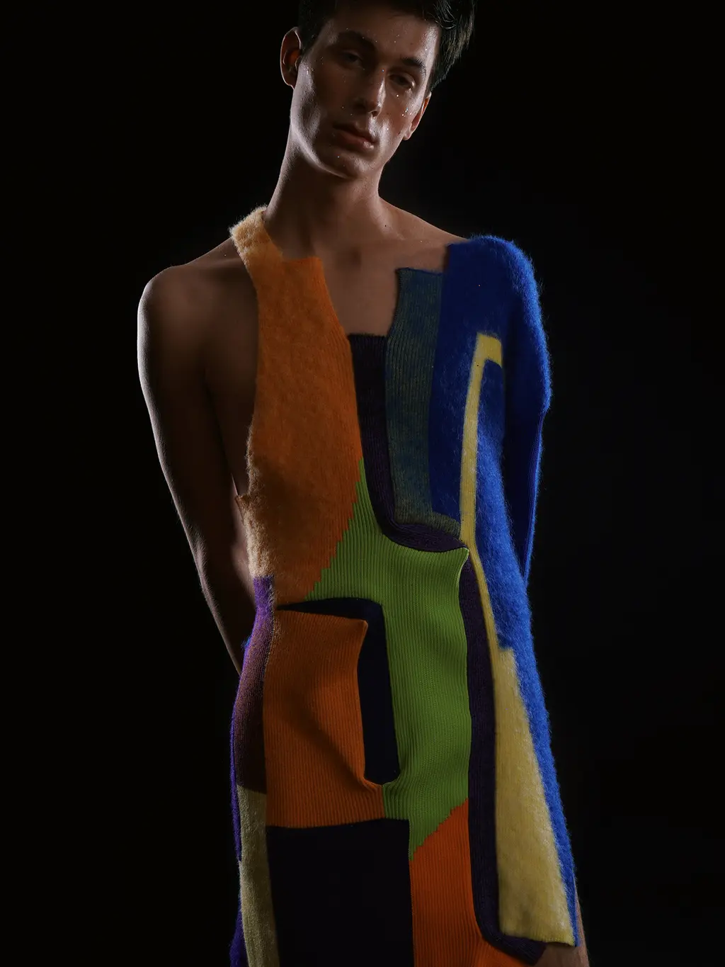 I am approaching knitwear as the inner structure of a garment, allowing garments that are typically precisely formulated, to be freed of these pre-designed silhouettes.