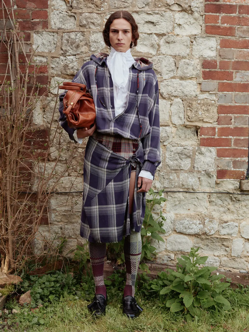 As always with Vivienne Westwood, its latest AW24/25 collection started with a dig through the library. Specifically: Johann Wolfgang Goethe’s tragic 1774 novel, The Sorrows of Young Werther, influenced the Romantic movement towards the end of the 18th century, when artists and intellectuals used intense emotion as artistic expression. All that formed a crucial starting point for the British house this season. The collection looked to the early-19th century “Empire style” movement: the extravagance of Imperial Rome, with references to classical antiquity and military uniform. Here, sleeves are full, collars high and drapery strong in wool and printed tartans, while closer up, military details are found in frogging on jacquard knitwear, and harris tweed that is given an updated whirl when combined with denim. Let the battle commence.
