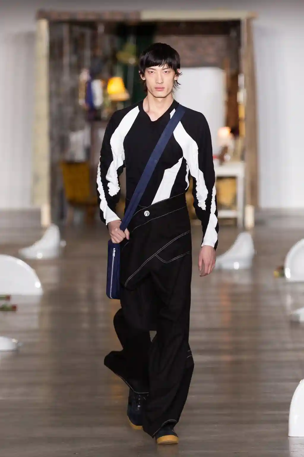 This most recent collection was all bare chests, artful thigh-exposing slits, denim chokers, ruched hoodies which stopped above the midriff and liquid-like fabrics. It was his satirical take on the London queer scene he’s so heavily involved in. “It’s important to make people feel glamorous, attractive, even sexy.