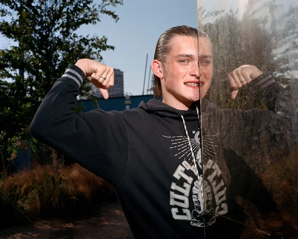 Oliver wears hoodie and T‑shirt ARIES ARISE, trousers HUGO and shoes MOON BOOT