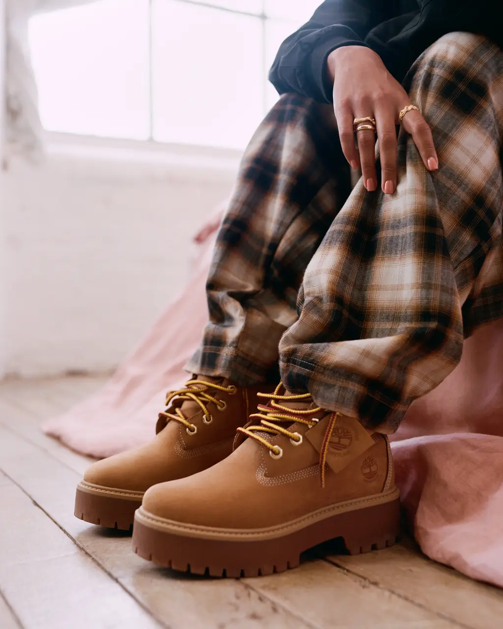 Naturally, it also shows off the collection. Leading the pack, the chunky-soled Everleigh 6 Inch Zip Boot is the kind of sturdy companion to take you from A to B to Z with no stress. The hero item for us? The festival-ready Pull On Tall Boot; special mention too, to its sidekick the Stone Street 6 Inch Platform Boot, daubed with the brand’s Original Yellow Colourway.
