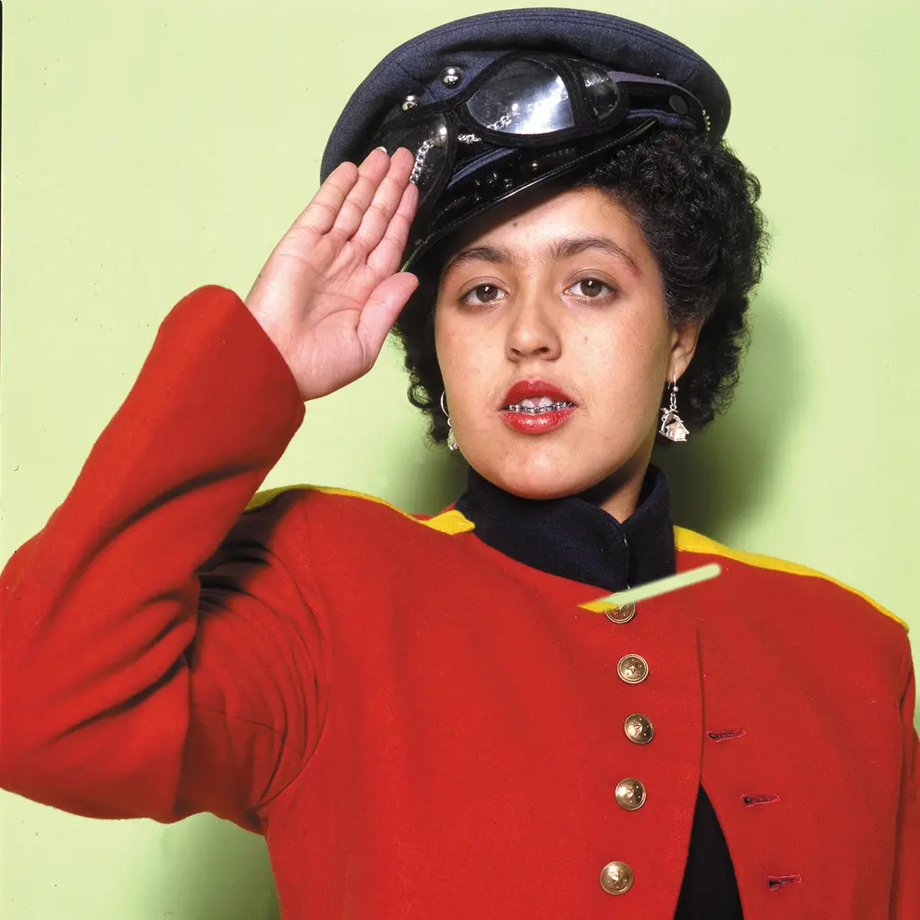 “Synthetic materials were quite new in the ’70s,” expands Bell. “Having a nylon suit was all the rage! My mum thought they were tacky – she was a hippie at heart – but, at the same time, they were perfect for Poly Styrene.” Styrene’s other influences ranged from ’60s futurism (“she loved the film Barbarella”) to glam rock and a penchant for all things military. “She had a very strong vision of how she wanted to look,” her daughter says, “and because she didn’t have much money, she achieved it by making the clothes herself, or buying them second hand in junk shops and army surplus stores.”