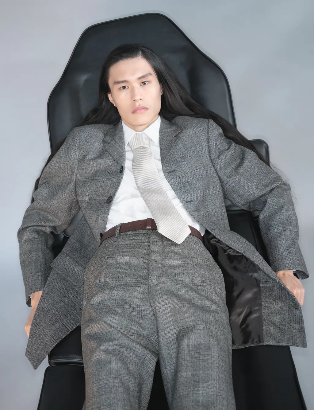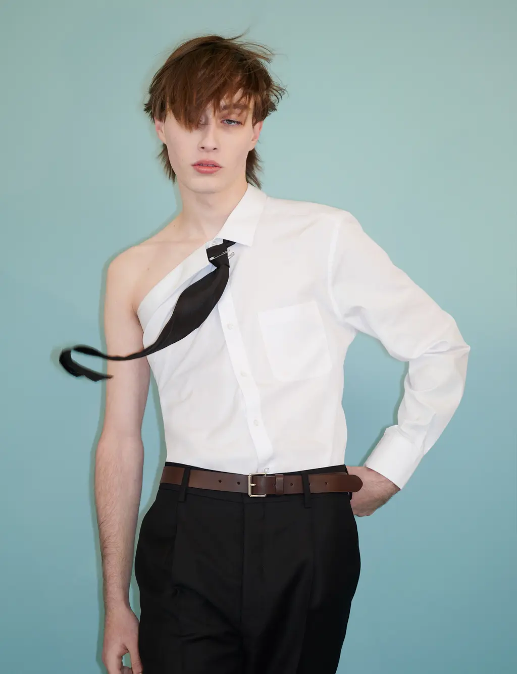 Uno wears jacket and trousers MARTINE ROSE, shirt CHARVET, belt OSPREY and tie stylist’s own