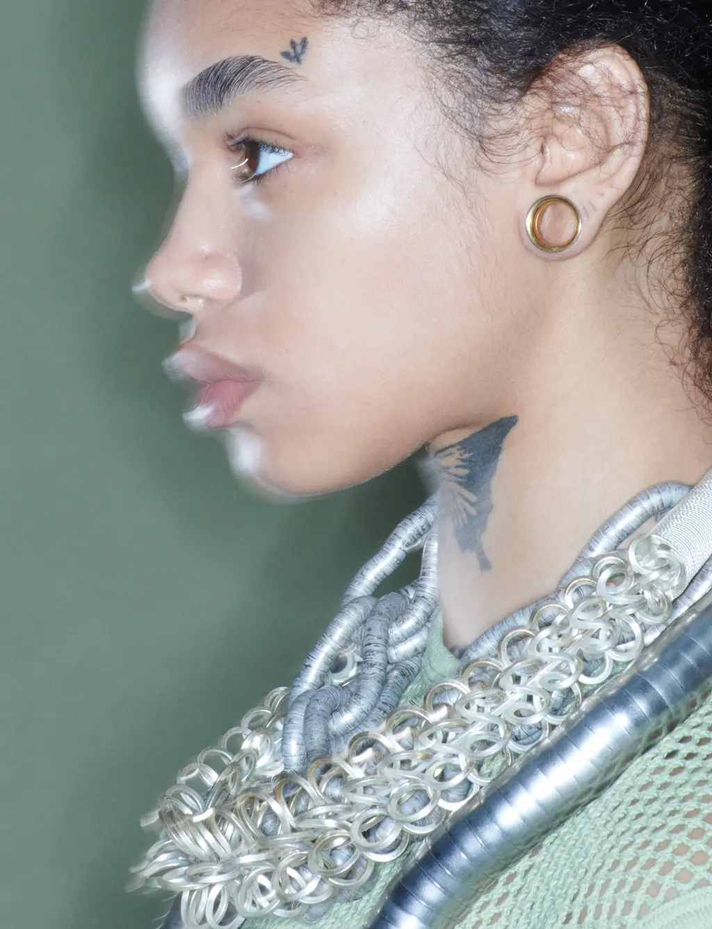 Dolly wears top RAF SIMONS, necklaces PEBBLE LONDON and earring talent’s own
