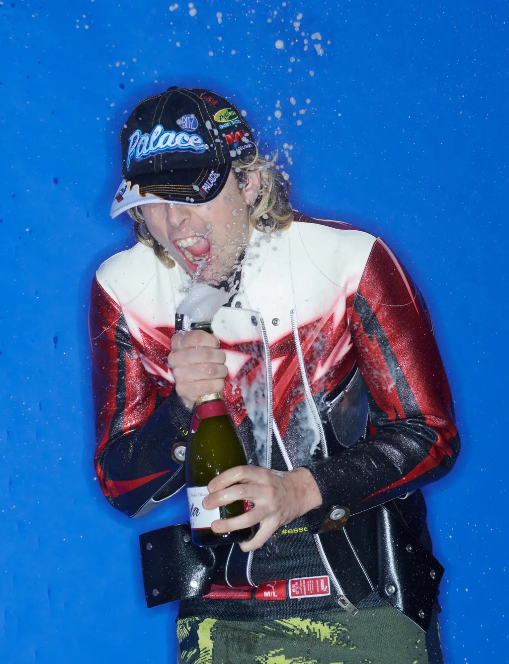Albi wears jacket LOUIS VUITTON, hat PALACE SKATEBOARDS, top and skirt FERRARI