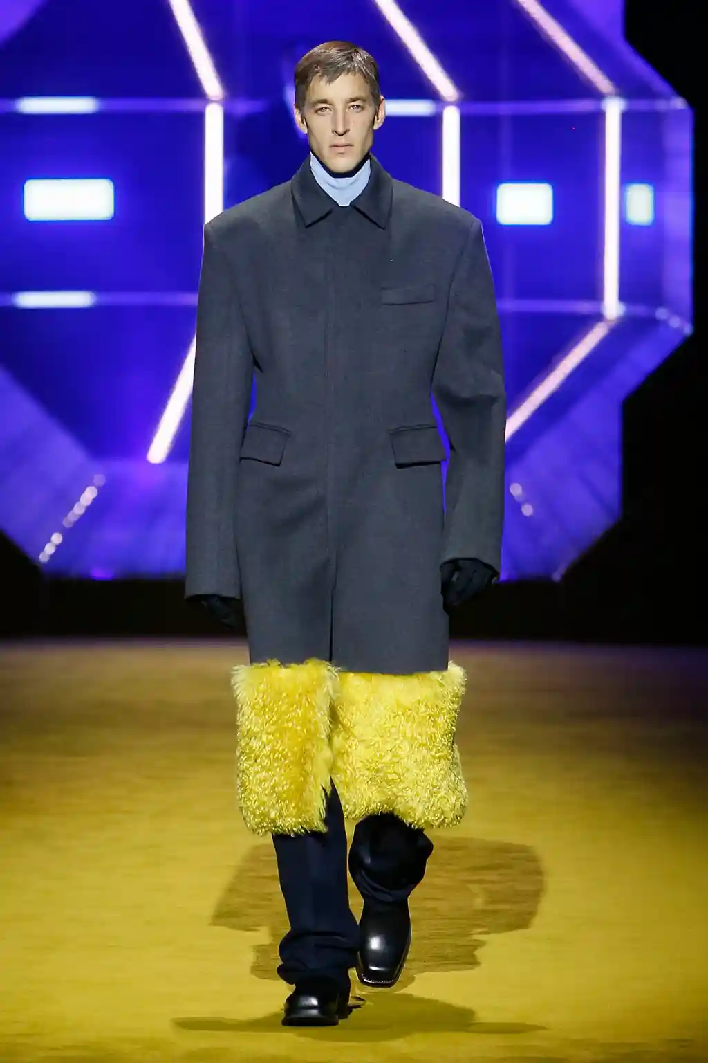 The AW12 menswear was steeped in power, picking apart male stereotypes through double-breasted suits that squeezed the neck, pinstripes, tailored top coats, fur-lined collars and evening shoes that were so polished, so expensive, so grand. Miuccia Prada told an editor that it was “a parody of male power” backstage (historically tough menswear pieces have transfigured into items of beauty and grace through the eyes of a woman), a transgressive approach to future menswear almost a decade before skirts became a very welcome addition to designer’s menswear collections, like the late Virgil Abloh’s Louis Vuitton and Jonathan Saunders’ Loewe.