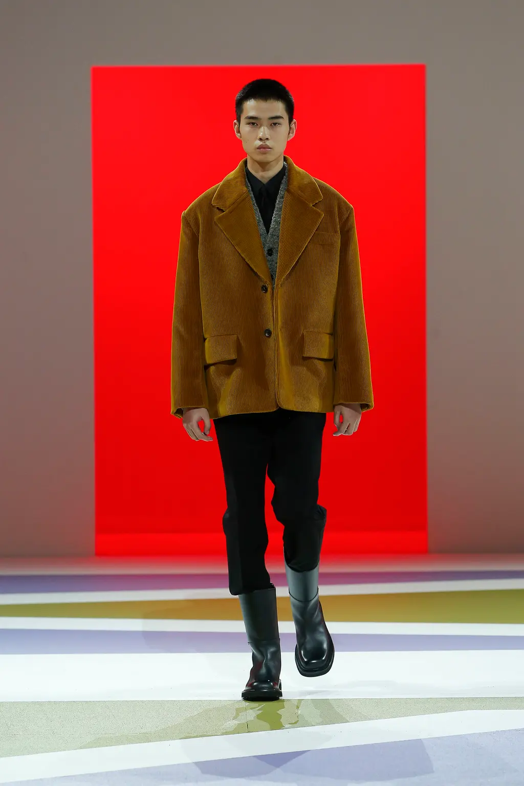 Miuccia Prada reimagines the commute as her models fictionally head to work across “a strange, di Chirico, surreal square” dressed in colourful shirts, nylon body warmers and jumbo cord blazers.