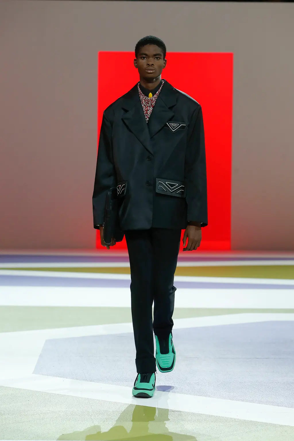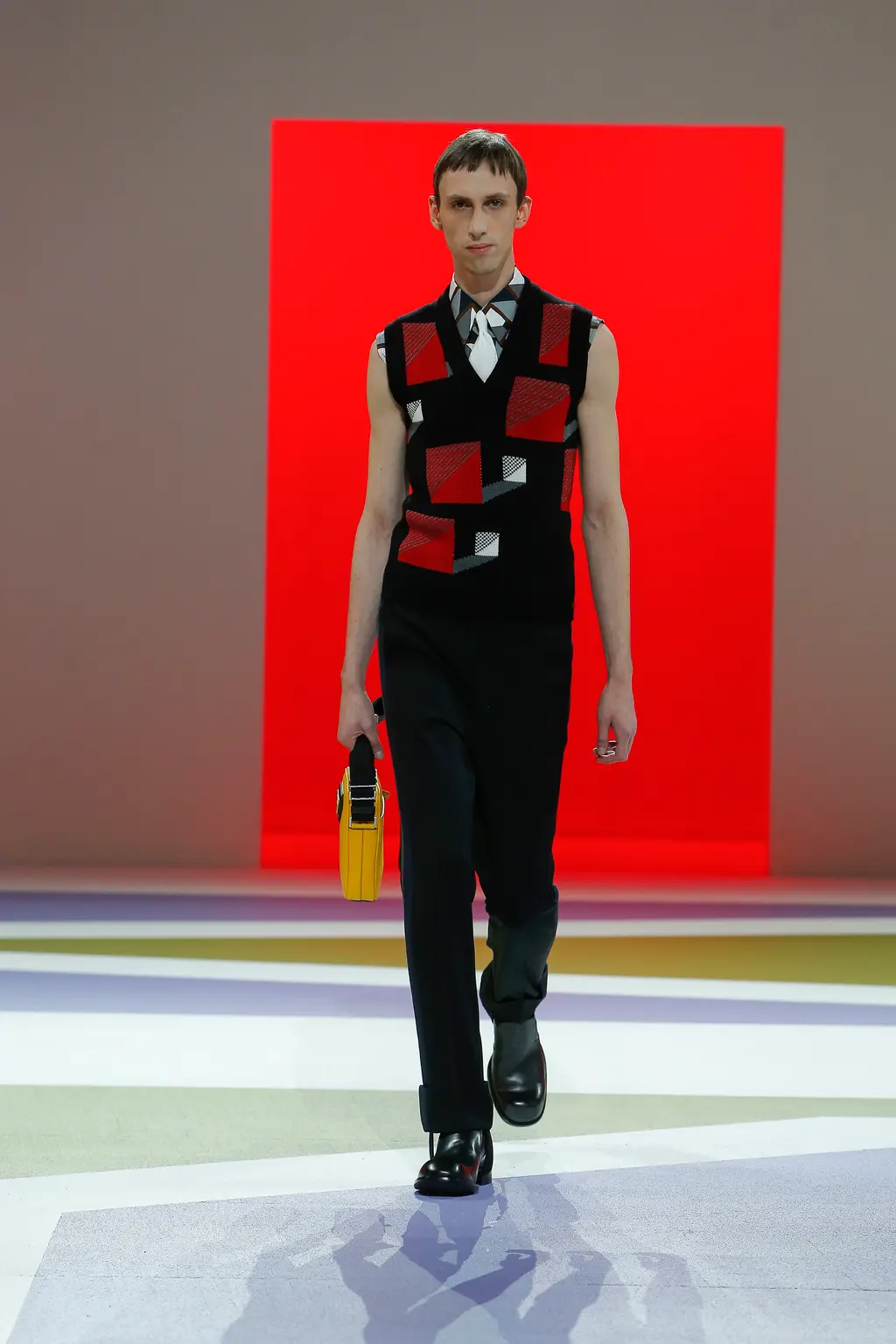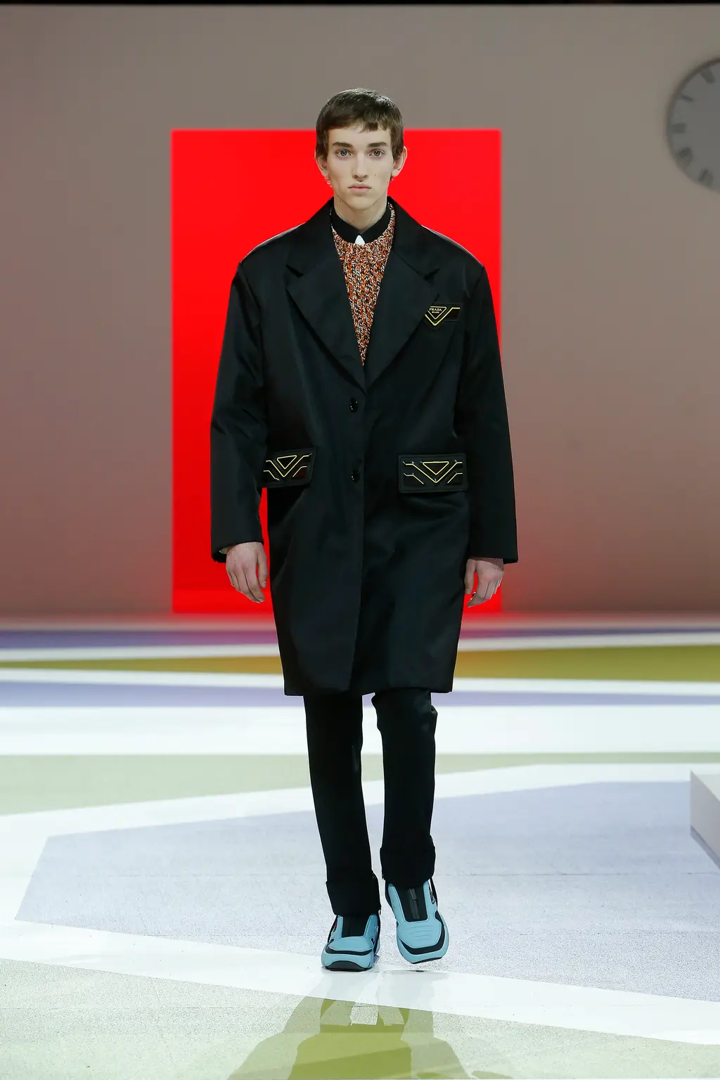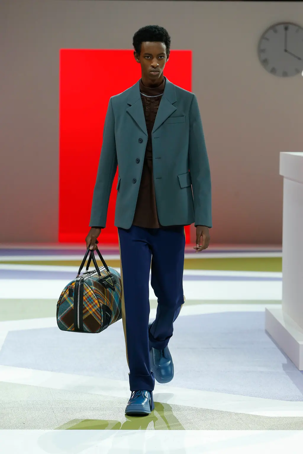 Dentists, farmers, bank clerks, fishermen, school masters and ‘80s synth DJs could all have found something to wear to their respective workplaces in Prada’s latest collection, which saw them all fictionally heading to work across “a strange, di Chirico, surreal square”.