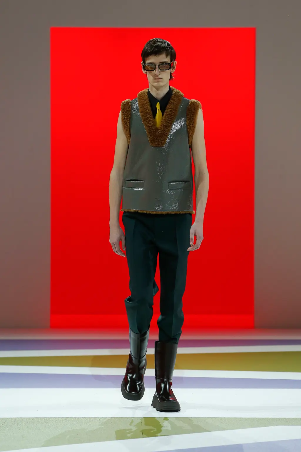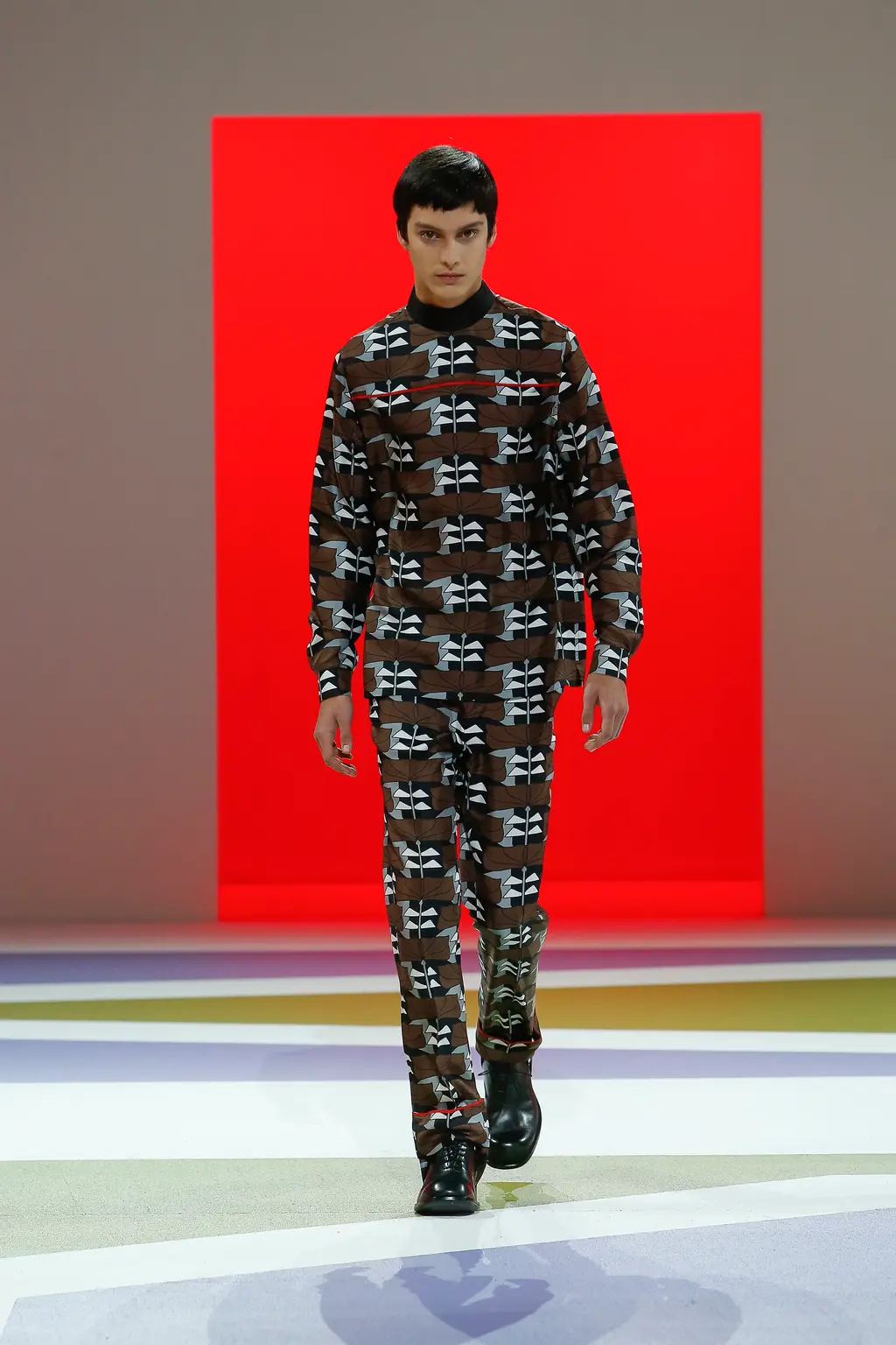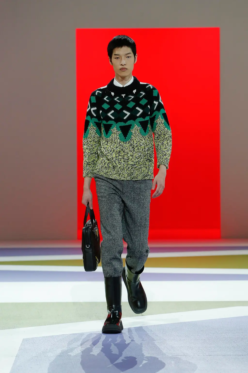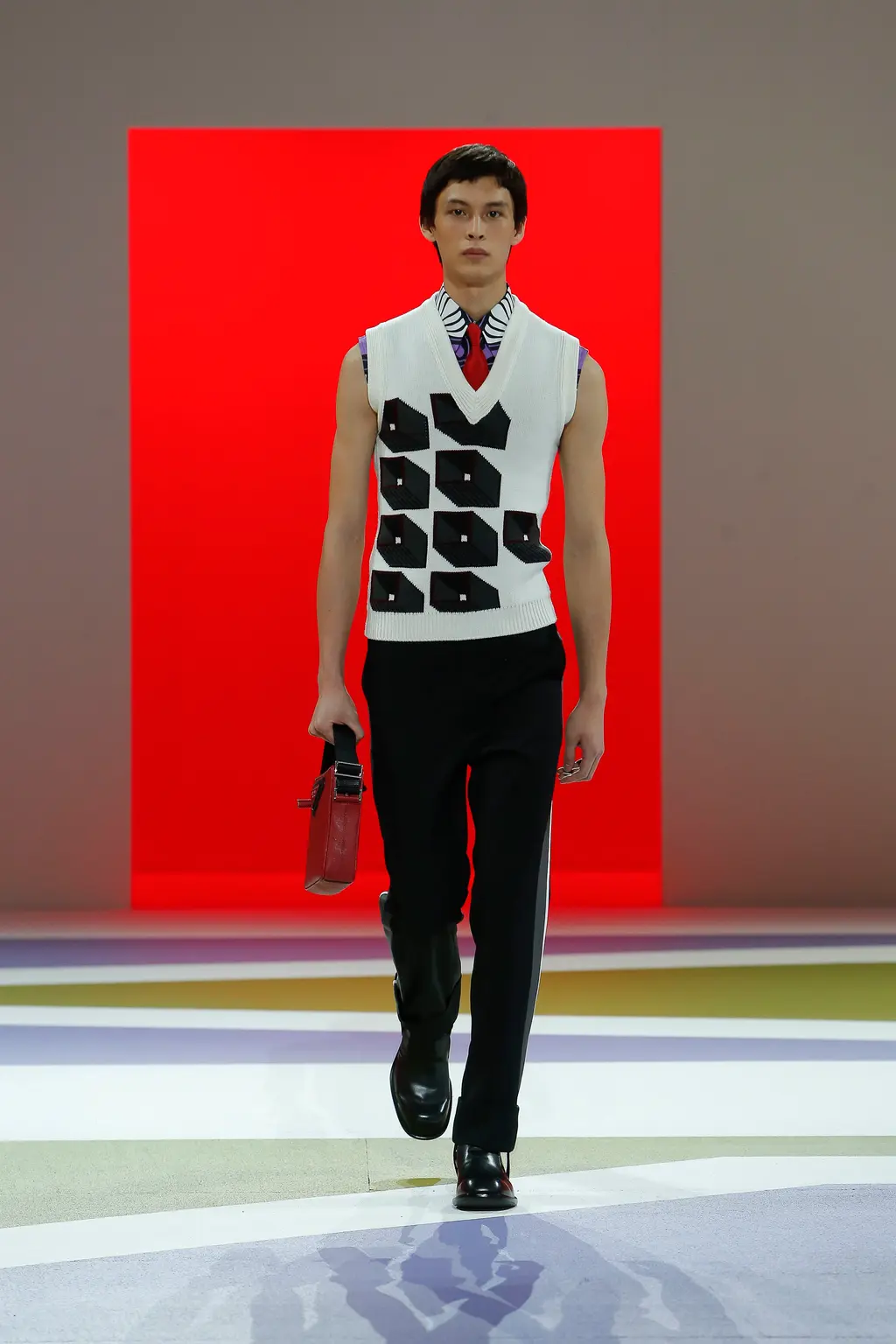 Dentists, farmers, bank clerks, fishermen, school masters and ‘80s synth DJs could all have found something to wear to their respective workplaces in Prada’s latest collection, which saw them all fictionally heading to work across “a strange, di Chirico, surreal square”.