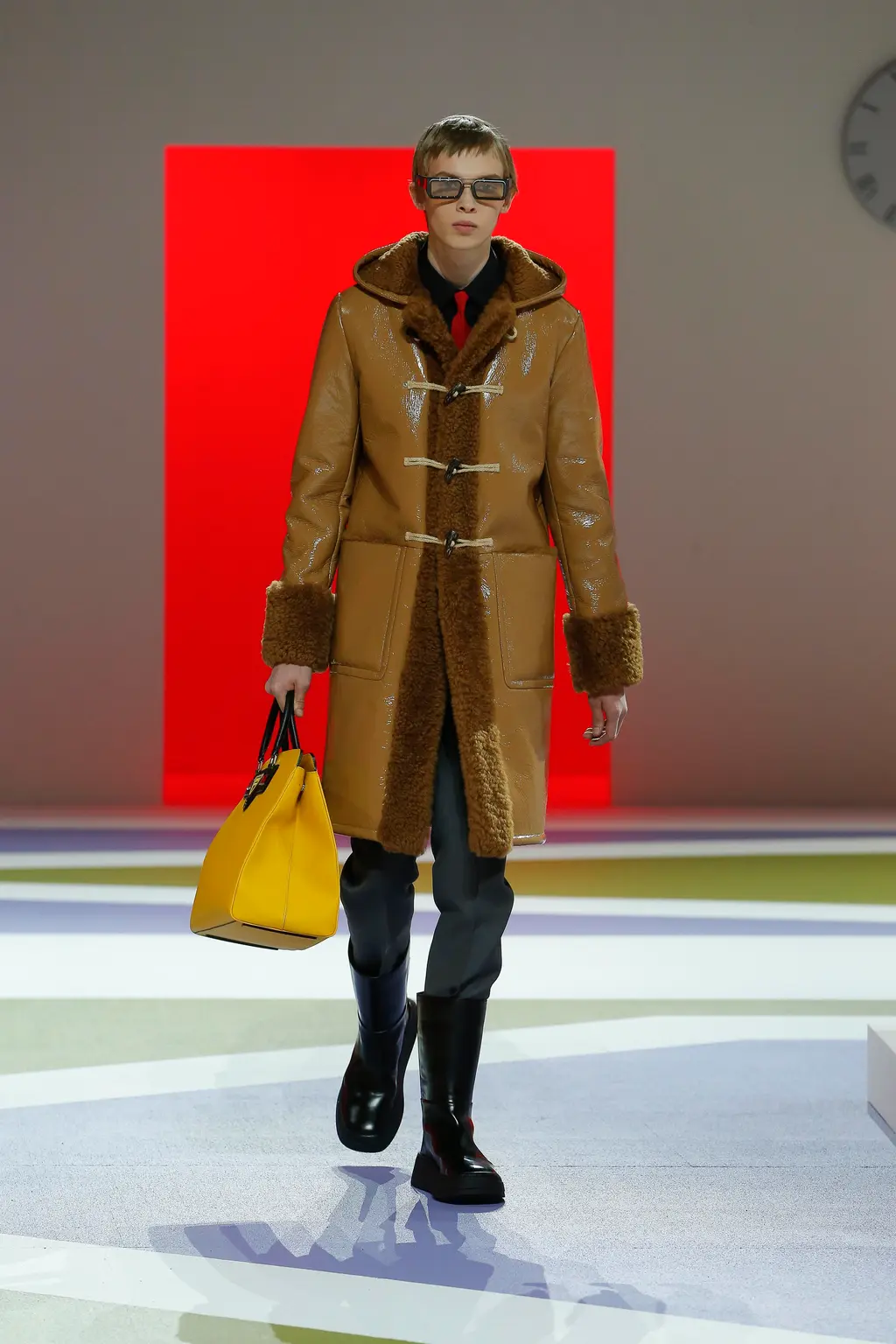 “I’m always thinking ‘What’s relevant?’” Prada said as people ate custard-filled, sugar-dusted bombas and sipped champagne backstage after the show. “And I think this is relevant at the moment.” Well, if anyone has a good gauge of the times, it’s Mrs Prada, so get in line if you want to be part of a new movement of satisfied people heading to work with a renewed sense of self-respect in polished mucking-out boots, beefy-lapelled coats, primrose portfolios, bright macs, tartan holdalls, vinyl shearling, trompe l’oeil pyjamas and, most vitally, stirrups.