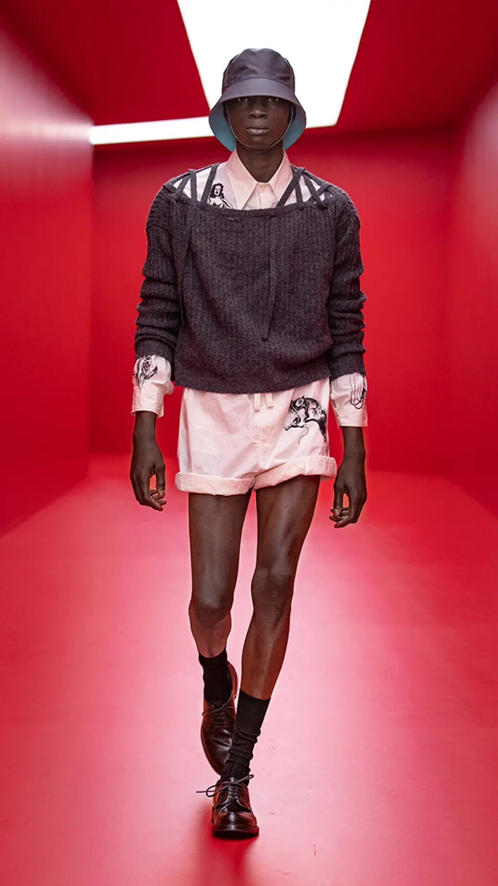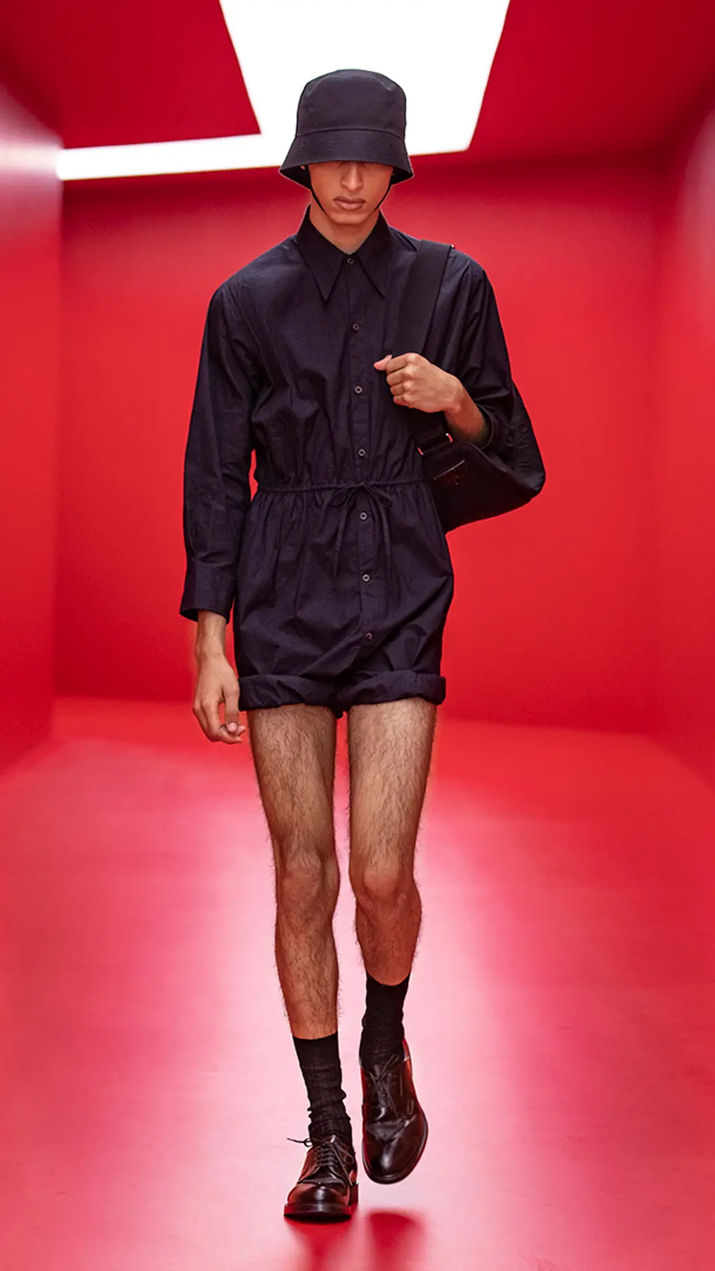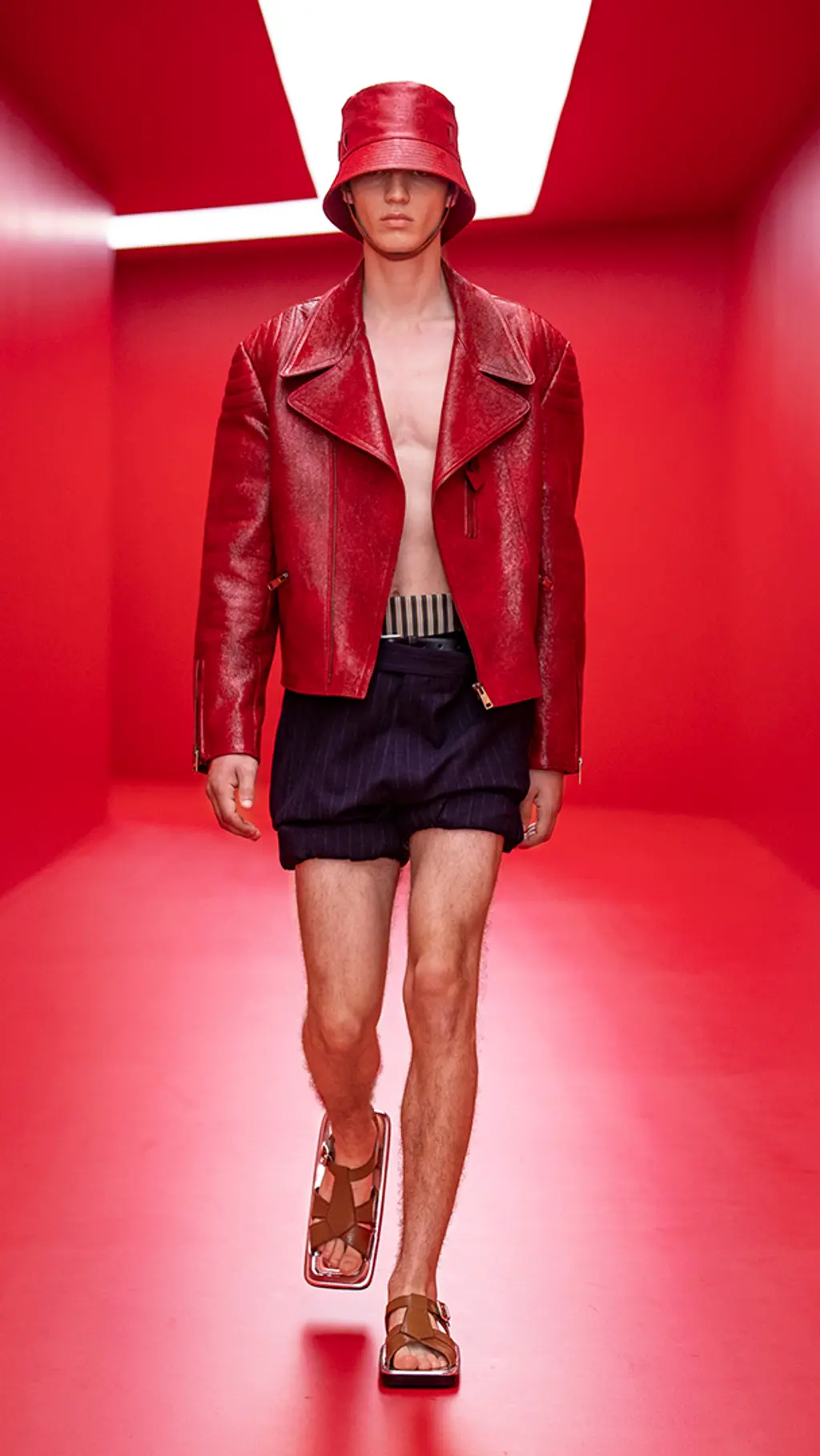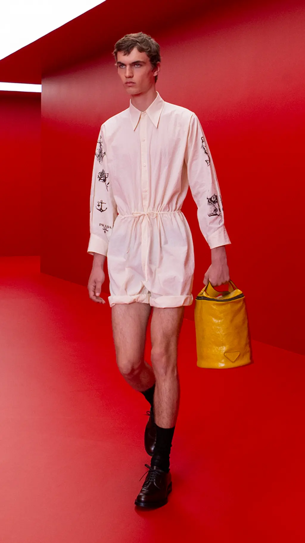 As for the clothes, the Prada guy now wears short shorts in just about every variety imaginable. Seeking something crisp and classic? Look no further than the thigh-skimming pairs in rich jewel tones, featuring a chic silver belt buckle with the Prada logo. Something more casual? Multiple pairs came with chunkily rolled-up bottoms, perfect for a quick splash in the water to cool off. Something to slip on for an easy-breezy full look? Put your trust in romper suits cut from light, airy cottons and decorated with tattoo-like motifs. There has already been much talk of the impending “summer of skin”, even as recently as the Fendi show on Saturday with its ab-baring reveals; it seems that Prada and Simons are firmly on-board with this trend, too.