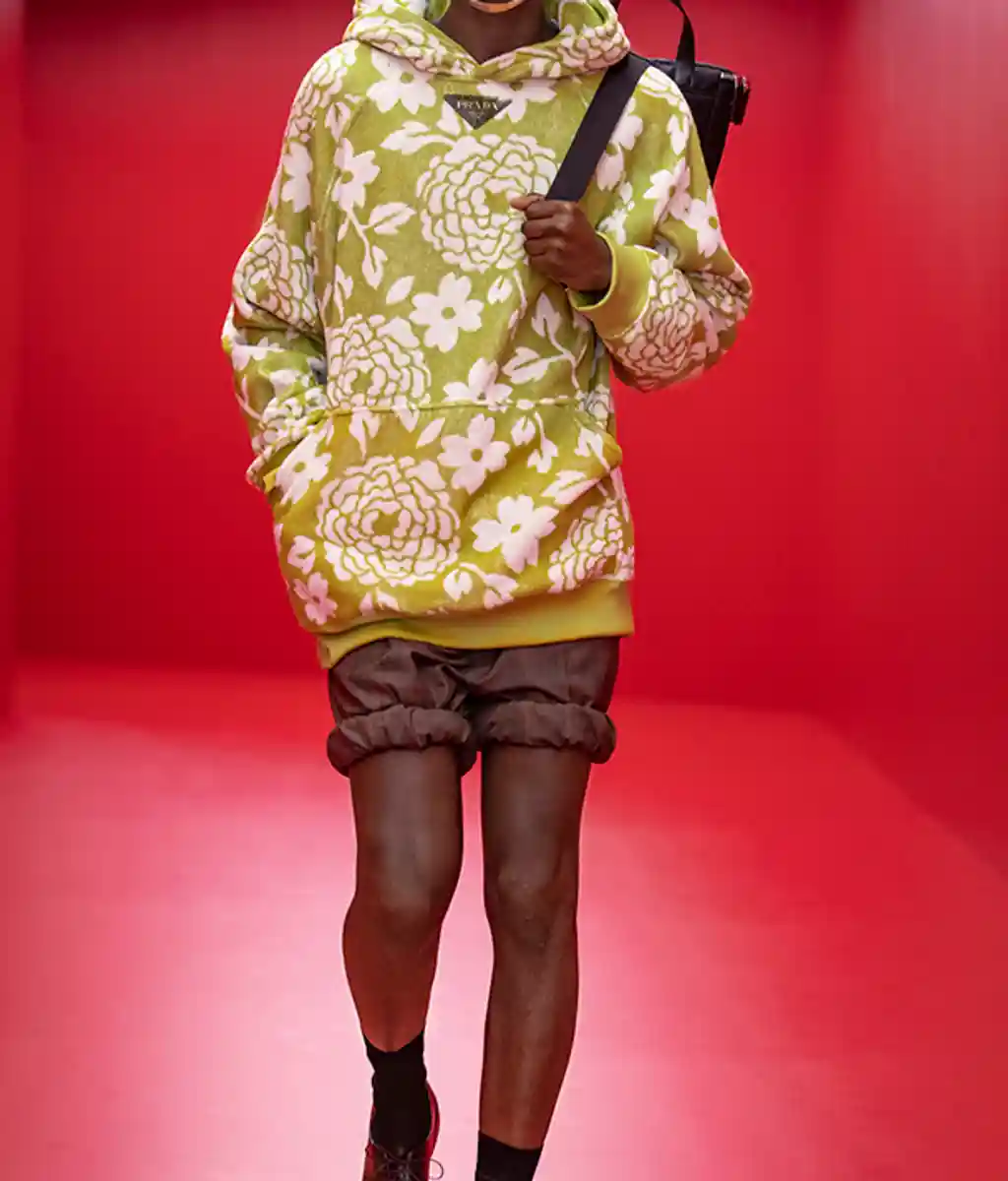 Elsewhere, instantly desirable knapsacks and bucket bags were asking to be stuffed with towels and sun lotion for a day out at the beach, while bucket hats came with the additional practical feature by way of slots to hook in the ears of your sunglasses. Terrycloth hoodies were printed with novelty floral patterns recalling beach towels. More broadly, the prints appeared to pay tribute to Prada collections of years past, as Simons has been wont to do since he joined the house last year (he’s clearly enjoyed digging into the archives as much as any of us would.)