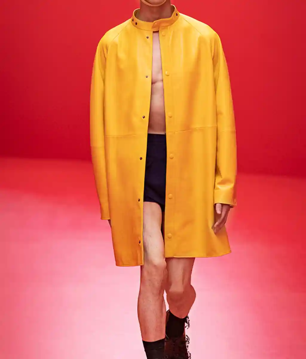 So what exactly did Prada and Simons’s vision of utopia look like? Well, at first, not very utopian at all. Models began by stalking what appeared to be the anonymous corridors of a spaceship, here in an arresting blood red. But for the show’s second act, their army of lithe young men emerged into the sunlight, wading into the sparkling seas or lounging on floating jetties painted the same shade of red, this time appearing not so much menacing as a joyful explosion of colour, that was echoed throughout the collection from acid greens to buttercup yellows.