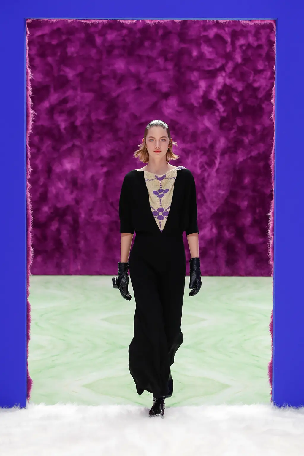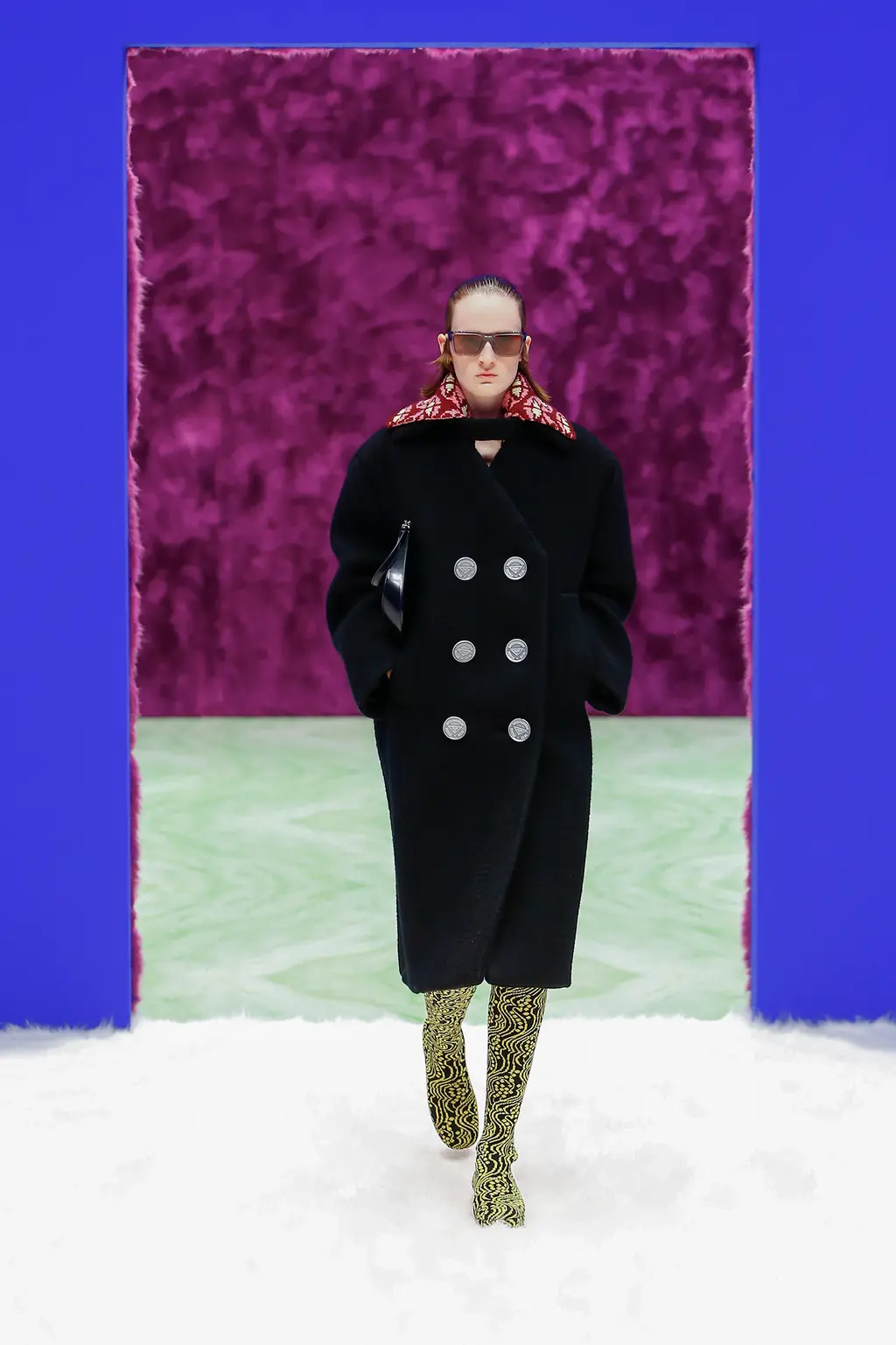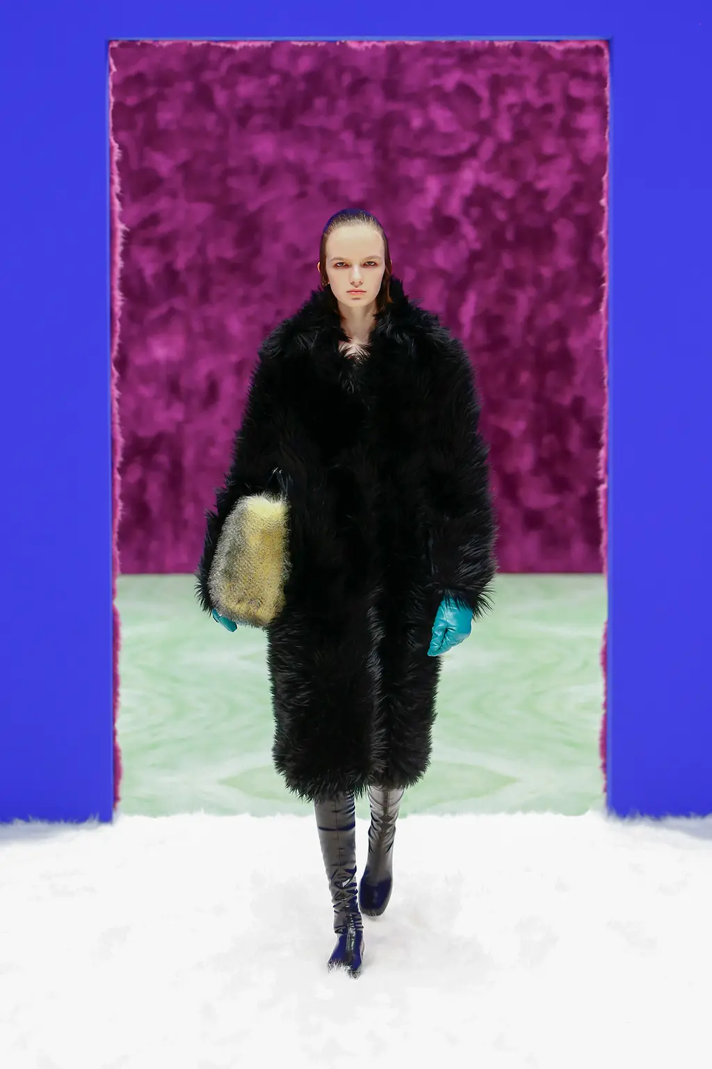 And with their second womenswear collection that premiered earlier today, it seems the pair have settled into their mutual groove even more comfortably. Broadcast from their base of the Fondazione Prada in Milan, the Rem Koolhaas-designed set of faux fur and marble created a luscious, textural backdrop so visceral it left you wanting to reach out and stroke – even if that won’t be possible for now – while the throbbing soundtrack of minimal techno courtesy of musician Richie Hawtin felt optimistically club-ready. (Again, for that, we’ll have to wait a little longer.)