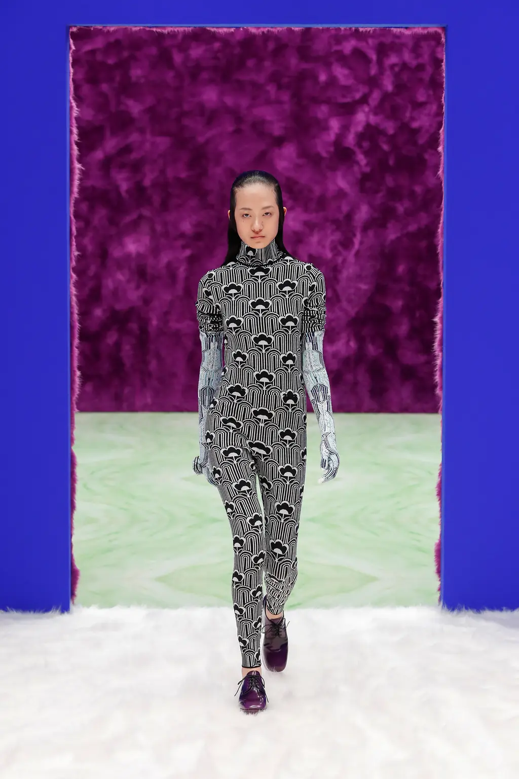 There were plenty of star pieces to be found for Prada obsessives: the return of the gloves from last season that come with tiny zip-up pouches attached; chunky printed boots with clog-like heels in a bold spectrum of colours; opera coats worthy of a Hitchcock heroine and jackets falling off the shoulders to be held in place with a single hand. A series of faux fur-trimmed shawls carried all of the dishevelled, cinematic glamour that is quickly becoming the duo’s calling card, while bodysuits covered in Art Nouveau-inspired prints lent the collection an unexpected, if only slight, athletic edge, too.