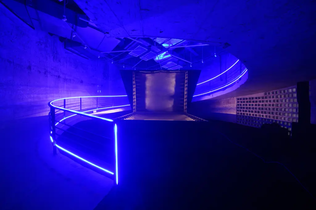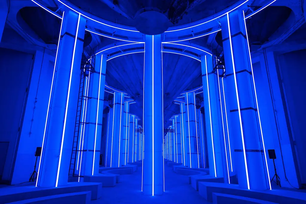 In a vast Tron-style, neon-lit old silo warehouse space in Minsheng Art Wharf, East Bund, Shanghai, China. Location set-up concept by OMA/AMO.