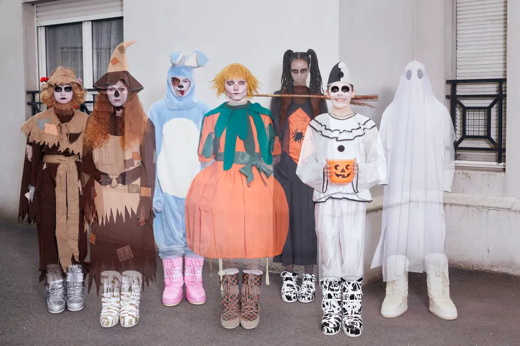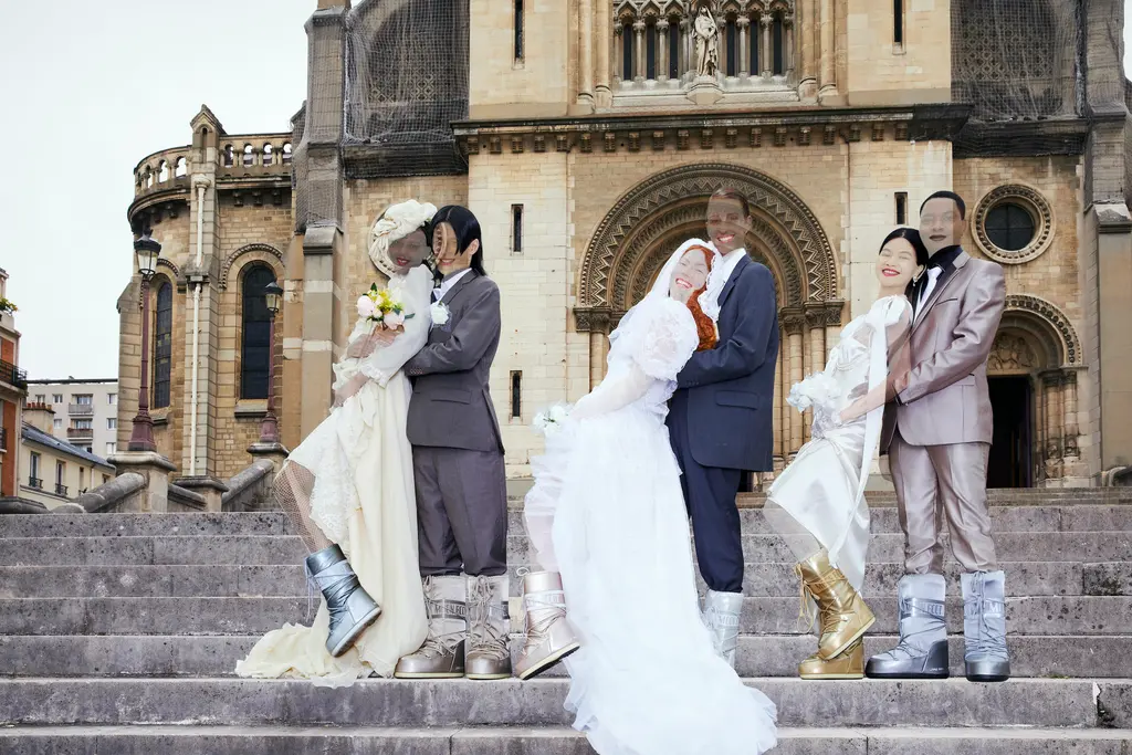 They’re different scenarios, with different characters representing different moments – there’s a school scene with a teacher, and two girls who look like (00’s pop sensation) t.A.T.u. In the wedding scene, the fading couples look like they’re already growing older; the effect is quite cinematic. There’s a sunbathing scene in Buttes-Chaumont park and a tourist-selfie scene at a cave there. The Halloween scene was fun: Halloween’s my favourite holiday and I thought the costumes would look great with the Moon Boot collection – I love the fur, the patterns, the animal print.