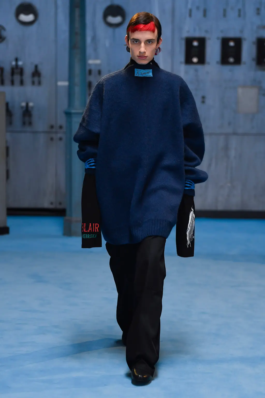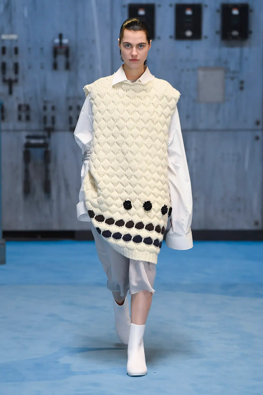 Every look seemed to channel his history of weird and wonderful design references, as if gently whizzed up in a blender. Most importantly, though, the exuberant pick-and-mix spirit of the collection and its lopsided, Frankensteinian proportions were just a whole lot of fun, ready to be worn by his loyal teenage fanbase, but just as appealing to an older generation ready to live their most spirited (and cosiest) life in one of his colourful knits.