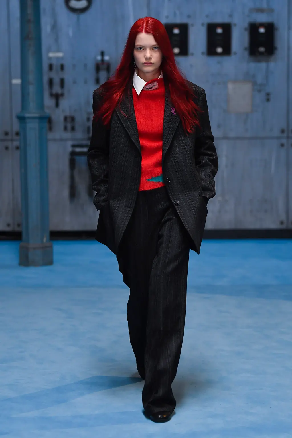 As the lights went up on Raf Simons’ show yesterday, it was his encyclopaedic knowledge of film history that shone through first. There were the computer units straight out of Alien’s Nostromo spaceship, industrial spiral staircases lifted from Fritz Lang’s Metropolis, retro fonts nodding to Kubrick’s 2001: A Space Odyssey: all references that Simons has touched on repeatedly in previous collections across the decades. But even given a legacy of paying homage to his favourite sci-fi flicks, this collection seemed to mark a new chapter for Simons – and, perhaps more interestingly, one that felt like a diversion from the work he’s been doing with Prada over the past two seasons.