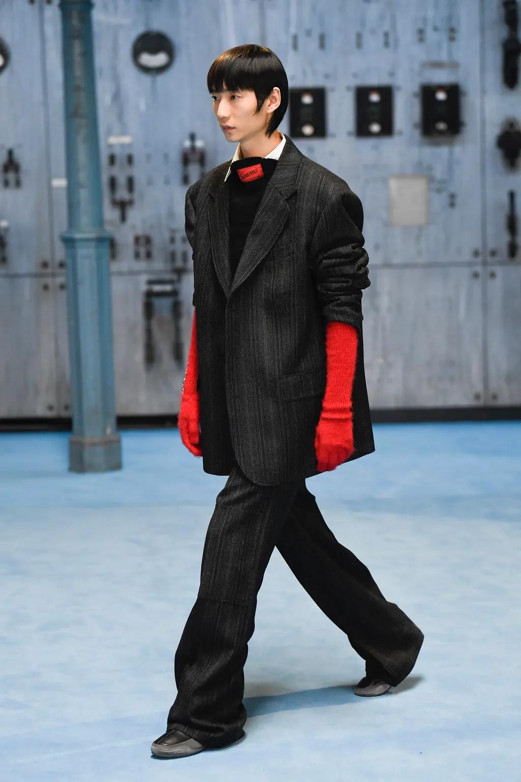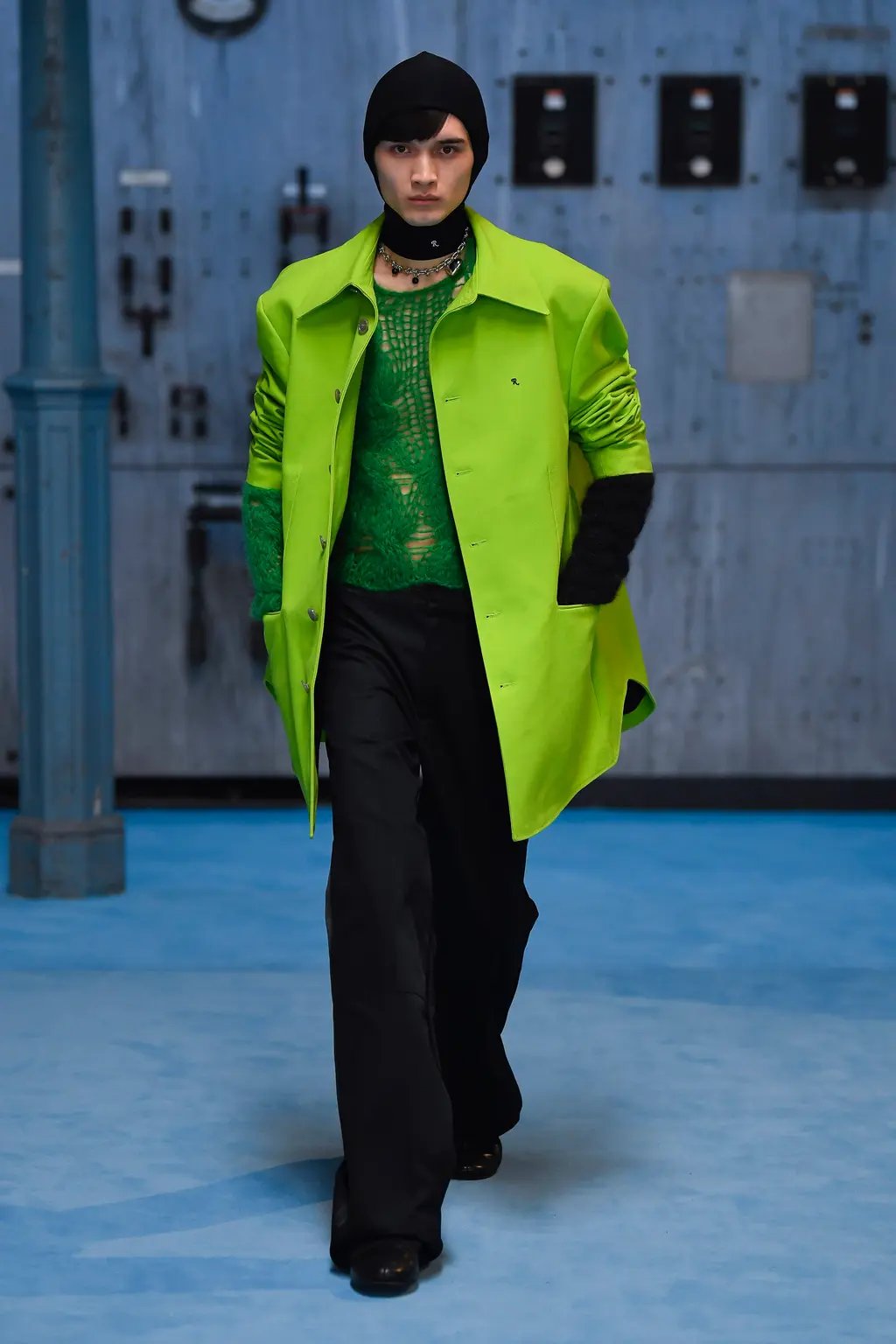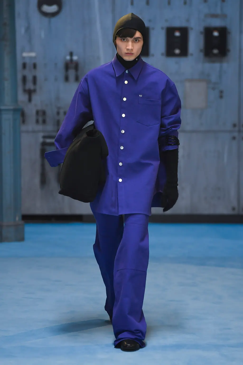 Despite an eternally laser-sharp focus on cut, shape and silhouette, this was a collection about excess – but Simons’ own definition of the word. There wasn’t a baroque curlicue or glittering crystal to be found here. Instead, his more austere and considered approach to exaggeration saw him take his tailoring and outerwear staples to their most extreme proportions. The standout looks? Quilted coats with bustle-like protrusions on the back (think: Marie Antoinette goes to Berghain) worn on top of oversized knits that looked deliciously snug, even when cinched at the forearm with stitched cuffs or jewellery details, or accented with neon gloves poking out from underneath.