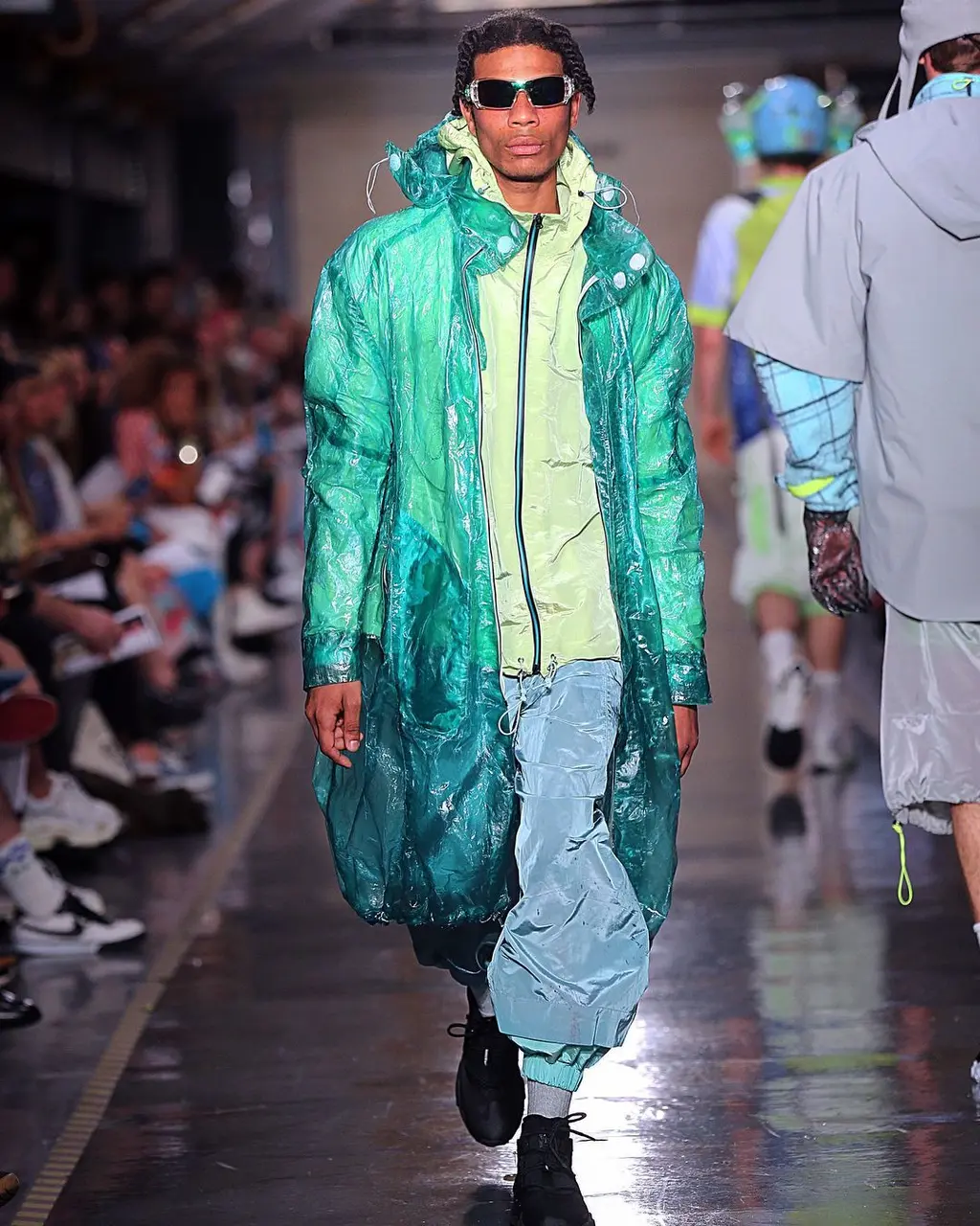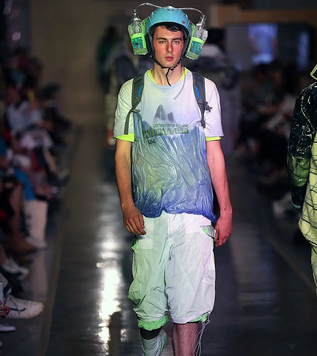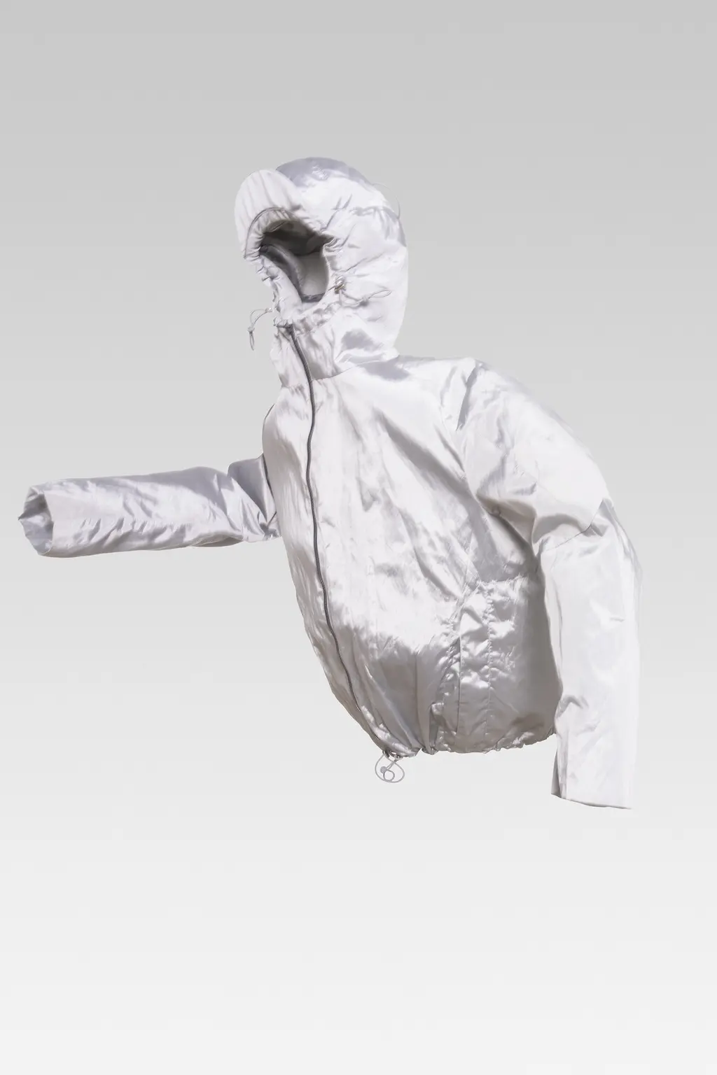 Kherba’s snow-clad research (slash obsession) eventually seeped its way into her final degree collection. Using nylon metal, the collection was a tech-nerd’s wet dream, with T‑shirts appearing frozen and stuck to the body, morphing from icy blue to white when heat was applied, as though they were ice cubes literally freezing in time. Outerwear and mostly hooded, knee-length jackets emulated the texture of wet flooring, or a foil blanket wrapped over bodies after skin exposure to extreme conditions. With support from Stone Island and Nike, it marked the proper beginning of Kherba’s ascent.