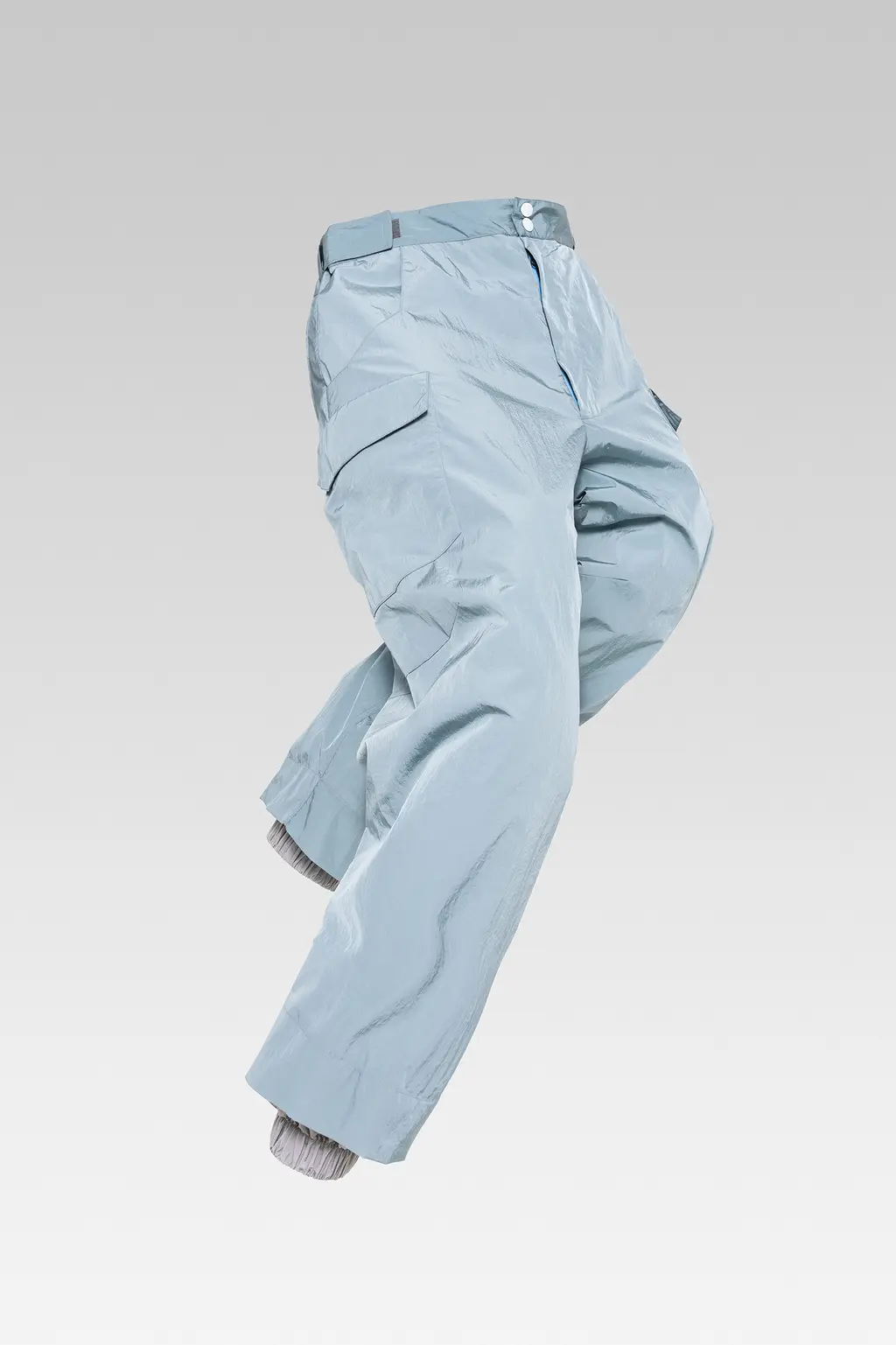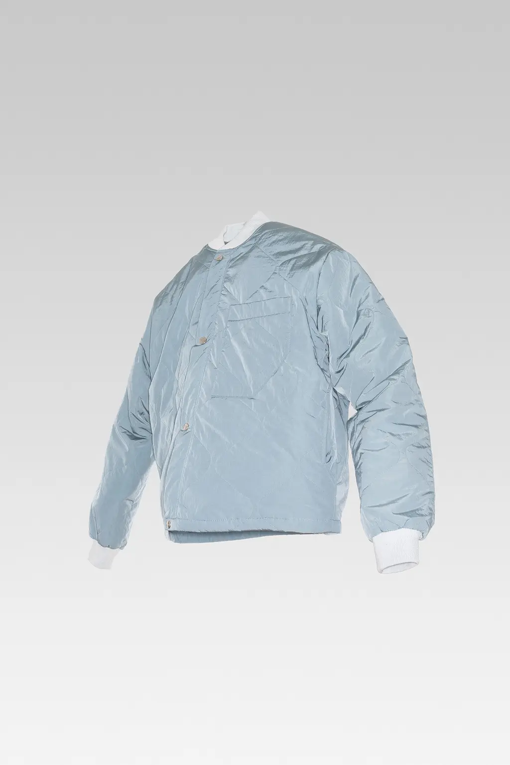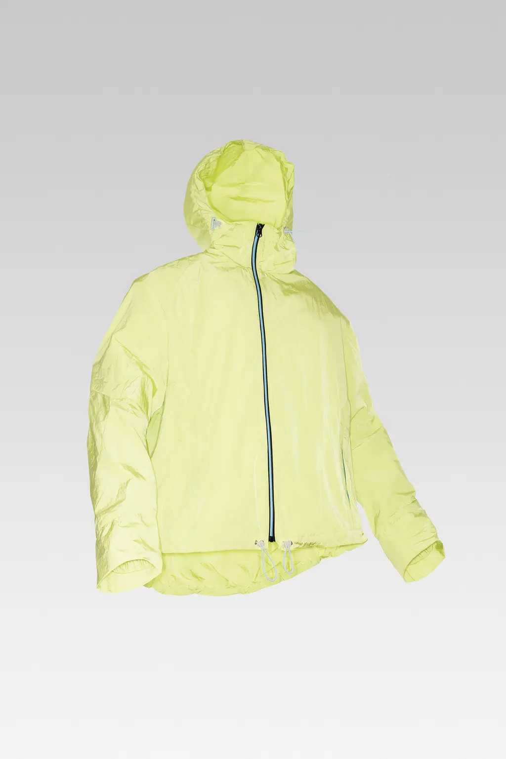 Kherba’s snow-clad research (slash obsession) eventually seeped its way into her final degree collection. Using nylon metal, the collection was a tech-nerd’s wet dream, with T‑shirts appearing frozen and stuck to the body, morphing from icy blue to white when heat was applied, as though they were ice cubes literally freezing in time. Outerwear and mostly hooded, knee-length jackets emulated the texture of wet flooring, or a foil blanket wrapped over bodies after skin exposure to extreme conditions. With support from Stone Island and Nike, it marked the proper beginning of Kherba’s ascent.