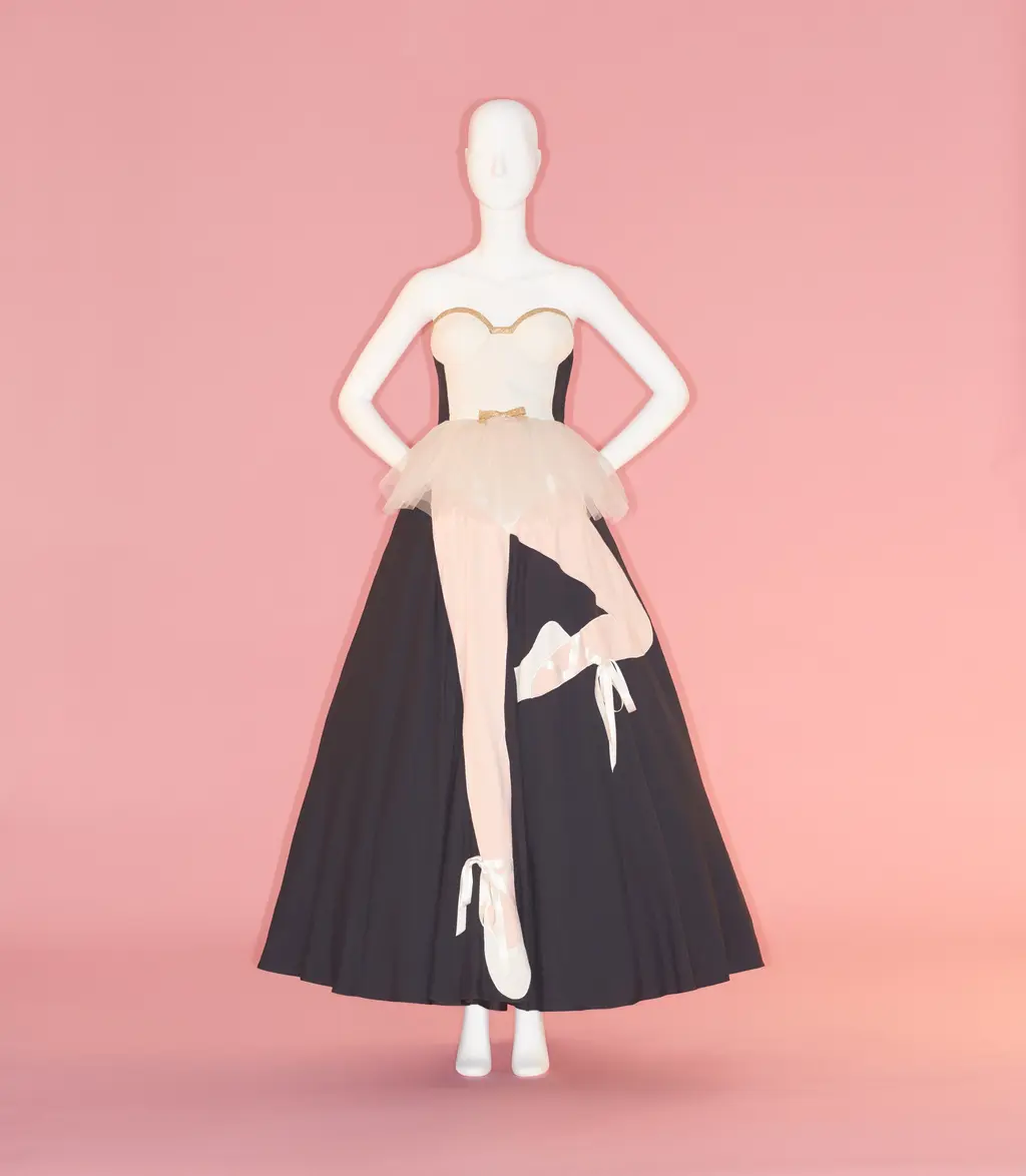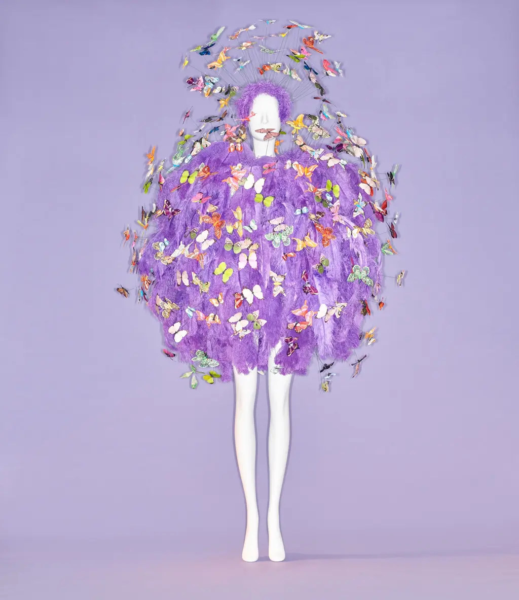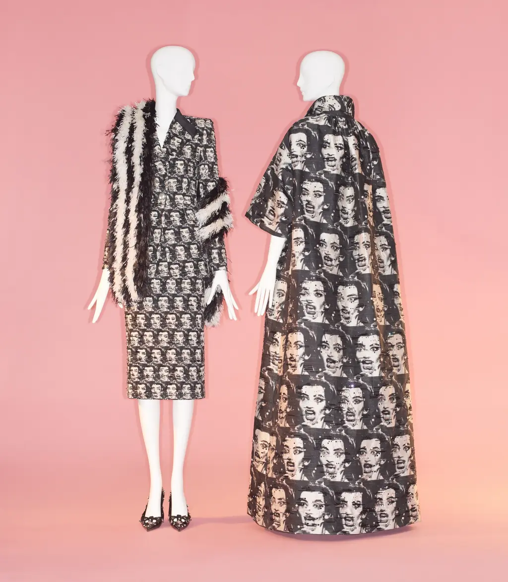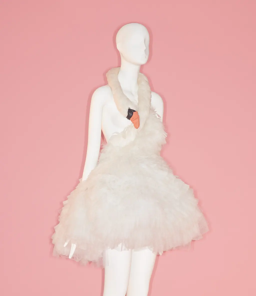 From trompe l’oeil and feathers to gender-bending and historicism, some of the most iconic designs of late 20th century fashion mix with some of the most creative today. There’s Margiela’s ruby tabi slipper, Marjan Pejoski’s swan dress worn to the Oscars by Björk, a Gucci logo suit by Dapper Dan, and additions by kitschy labels du jour like Vaquera, Pam Hogg and Moschino.