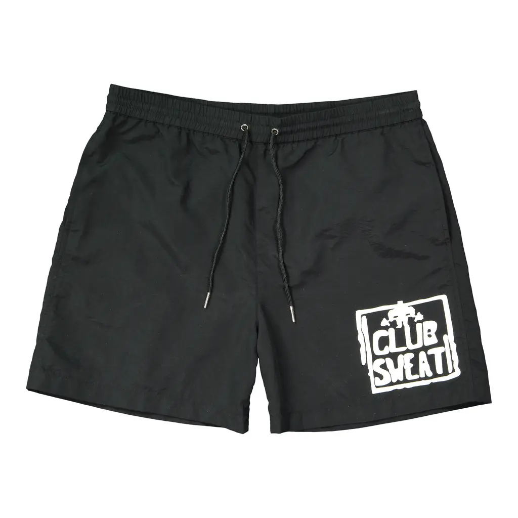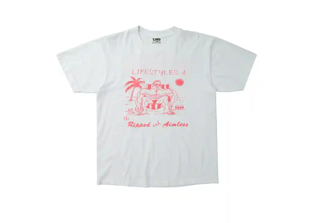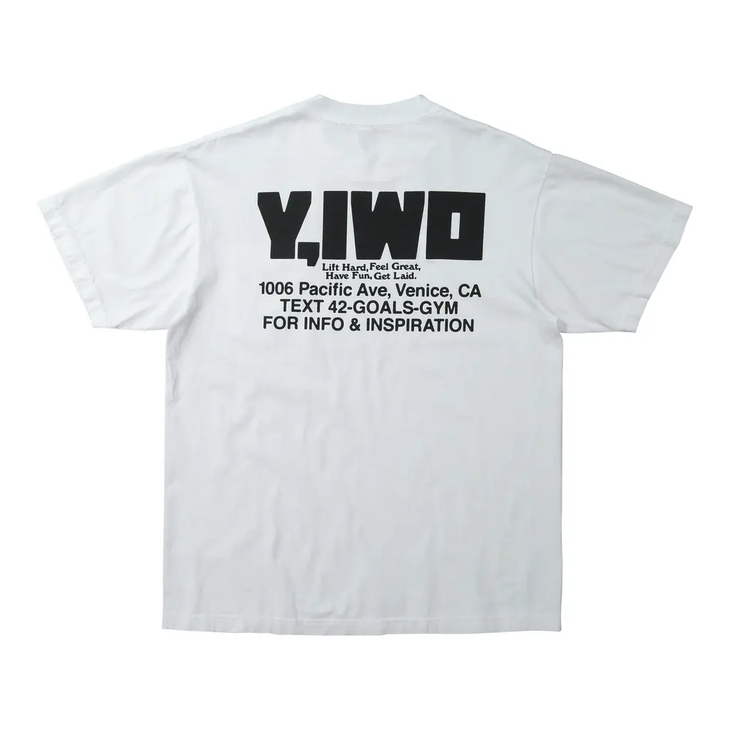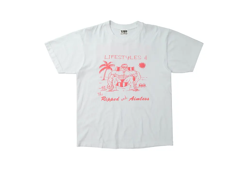 For the collaboration, Y,IWO founder Jason Thome has resurrected three of Drasin’s most recognised designs. Illustrations of a gym bro lounging on a deckchair under the words ‘Lifestyles of the Ripped and Aimless’, a macho guy leaning against a palm tree on top of the phrase ‘Gym Bums of California’, and the namesake ’Club Sweat’ slogan, will all be featured on an assortment of made-in-the-USA cotton tees and baggy nylon beach shorts. Y,IWO’s signature Stay Pumped stringer tank tops will drop alongside the collection, as well as new motivational Pump Iron Today tees.