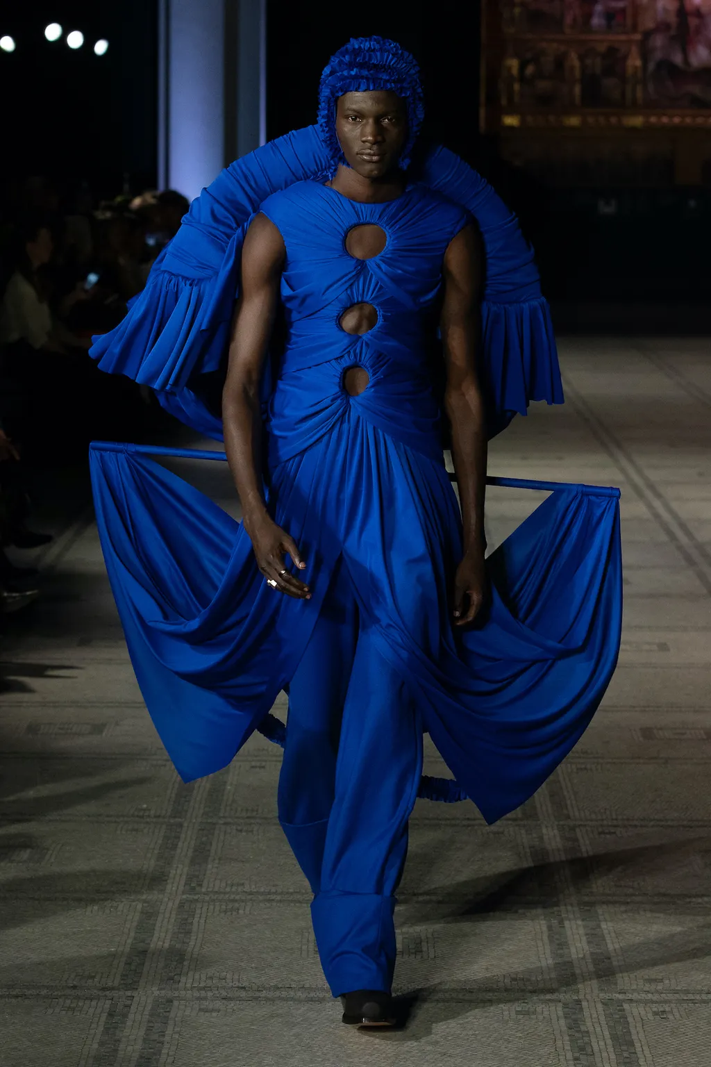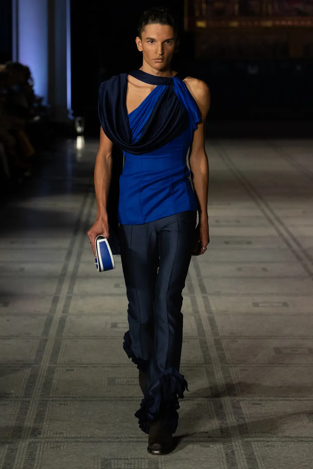 The closing looks were among the collection’s most striking. In a continuation of Malone’s chosen colour palette of electric blues and deep greens, the final three models came down the runway in sculpted one-piece garments. Structured shoulder and back pieces created a kind of mast around their bodies, bringing together all of the elements Malone introduced throughout the collection: masterful draping, ruffles leading into sensual ruching, bare shoulders and matching bonnets to boot.