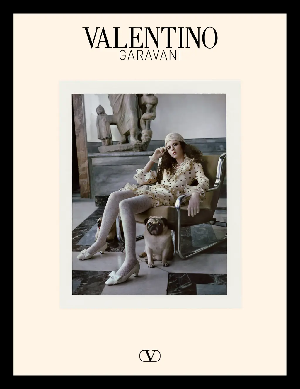 A recreation of what Michele imagines Maison Valentino to be like decades before he entered the picture, the campaign sees opulent muses clad in pastels, pearls and polished suits. Elsewhere in the campaign, a model stares pointedly at the camera, dressed in a polka-dot dress with a pug perched loyally at her side (pugs are a symbol of the house, would you believe).