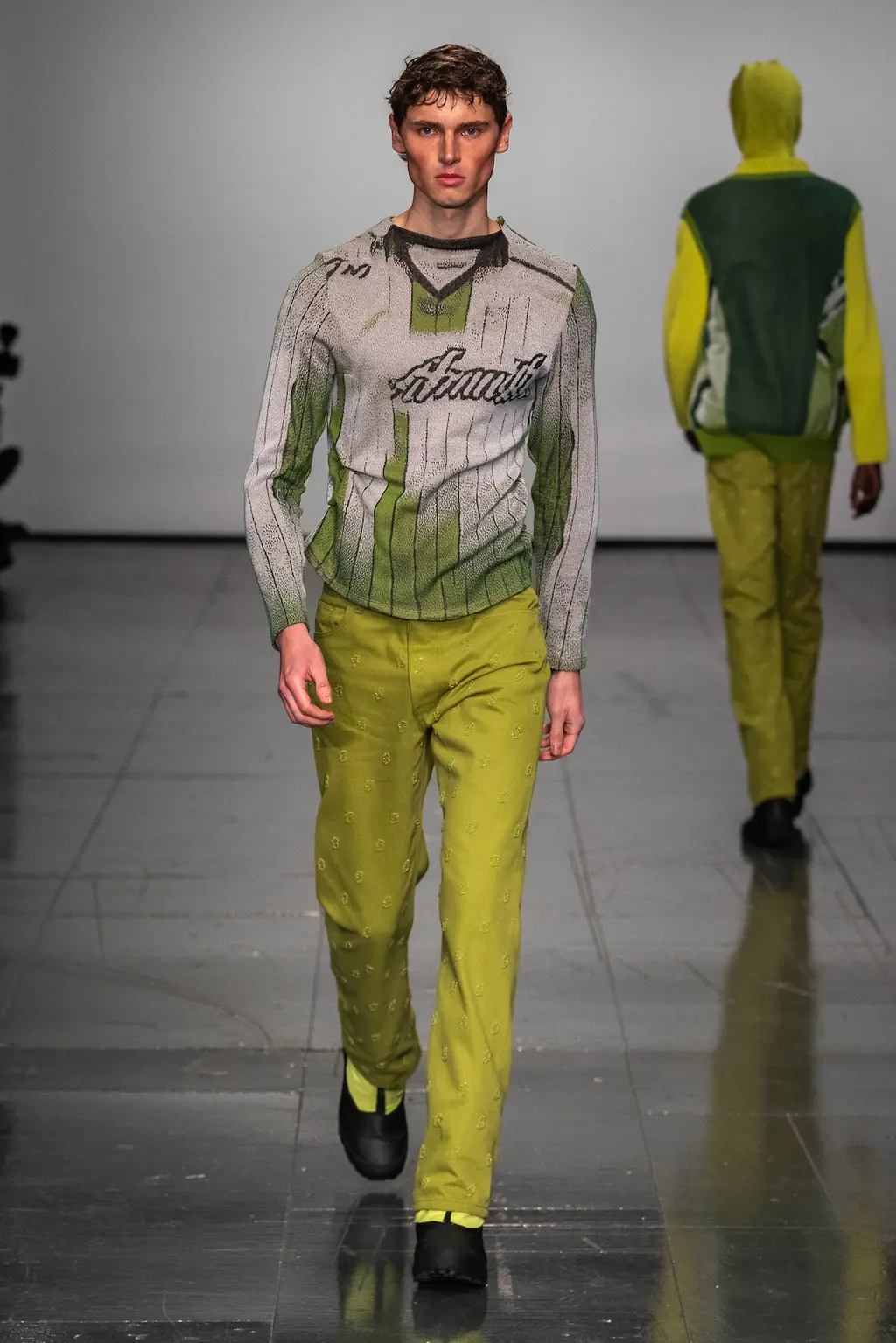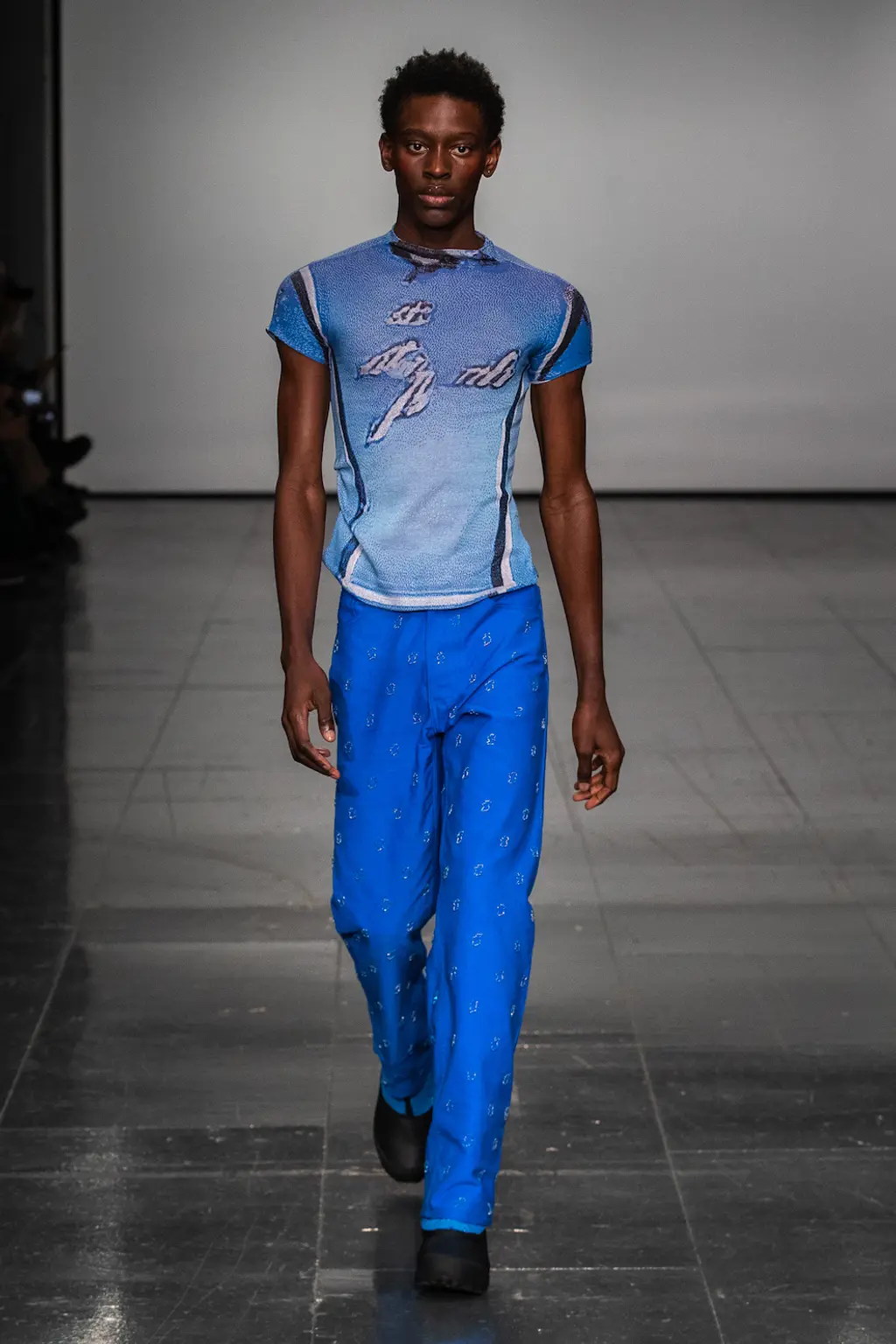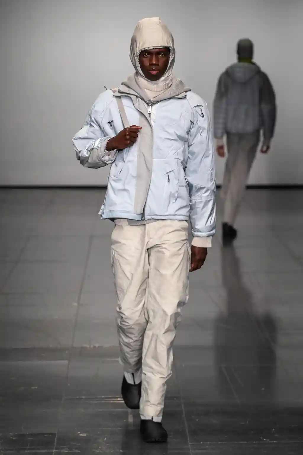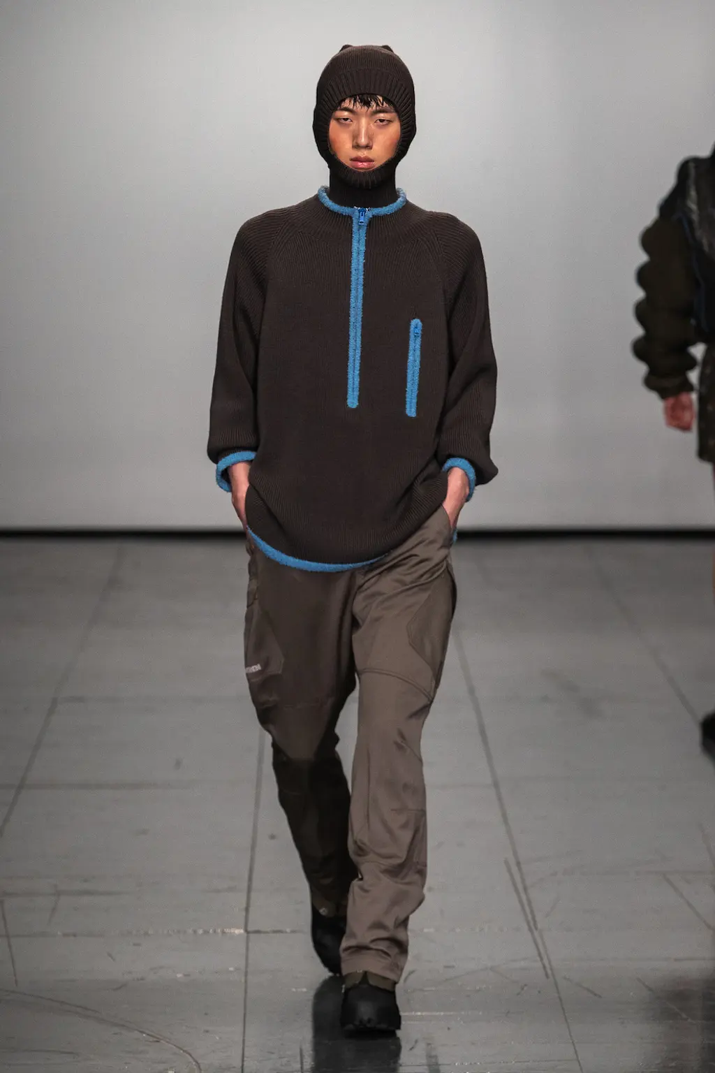 Irish menswear designer and Fashion East alum Robyn Lynch made a triumphant return to physical shows this London Fashion Week, with her largest yet most concise collection to date. It also marked the second iteration of her collab with outerwear giant Columbia, a continuation of the pair’s mutual knack for pushing the boundaries of textiles and fabrications as far (and as sustainably) as they can go. That ethos was at the forefront of Lynch’s AW22 collection.