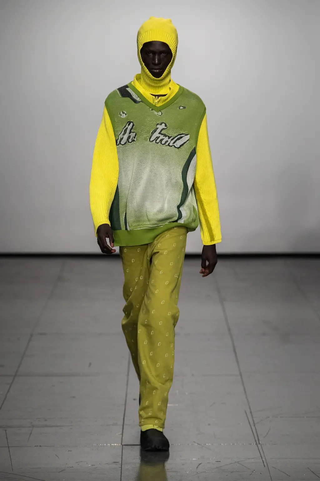 The show opened with a selection of acidic green and yellow get-ups, with balaclavas, luxurious knits and super-breathable trousers in tow. “I developed this viscose fabric from Italy and we coated it in a waterproof seal,” Lynch explains. “That means water rolls off in little beads to create a slime effect – the [trousers] look wet and, if you take a photo with flash, it creates these really interesting lines.”