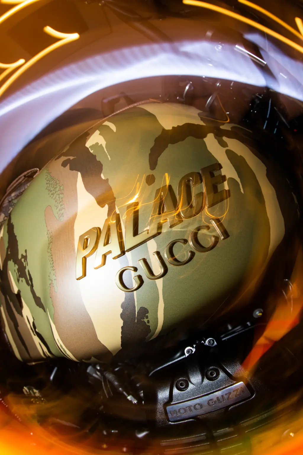 Pronto, if you’ve been living under a lunar rock (we don’t blame you): Palace Gucci descended from the heavens last week in the shape of a flying corner shop (see: the campaign). It saw the two clashing worlds collide and the debut of a new collection, now fully revealed, featuring mash-ups of Gucci and Palace’s motifs on horsebit loafers and retro football kits, poppy spellout tees and monogrammed jeans. Oh, and if you’re looking for something a little bolder, you can grab an actual Palace Gucci Moto motorbike developed with Moto Guzzi and clad in a mad camo print or one of 10 branded safes to store whatever else you cop from the collection.