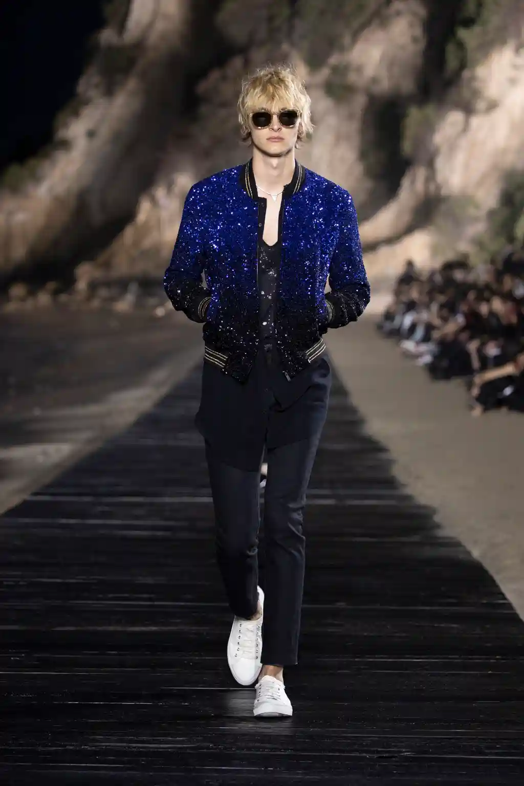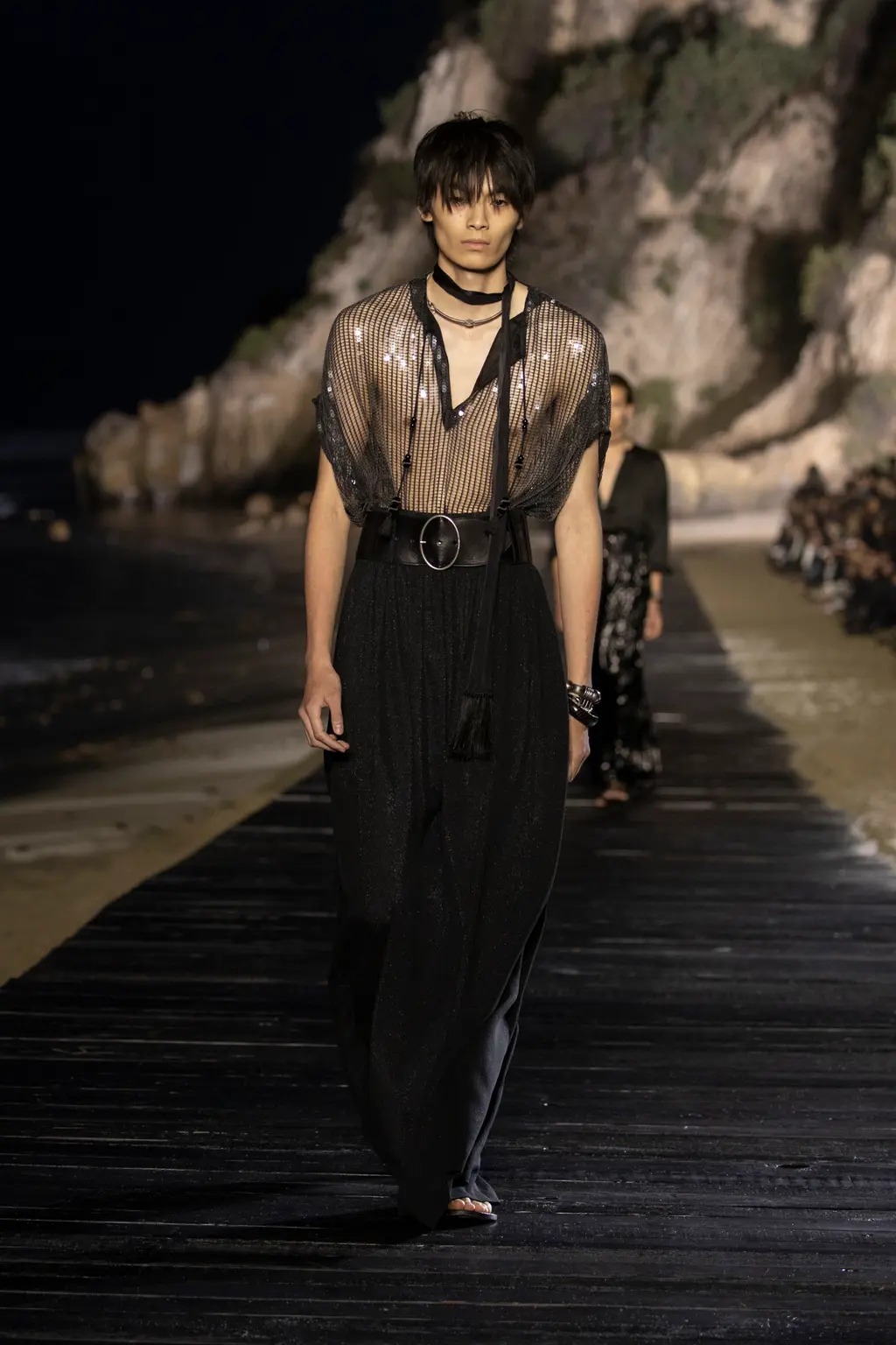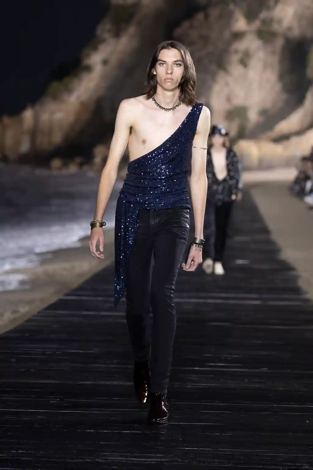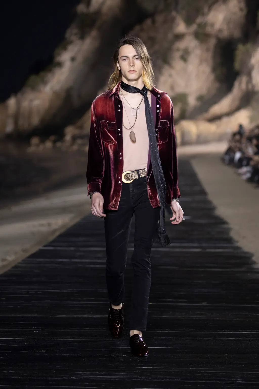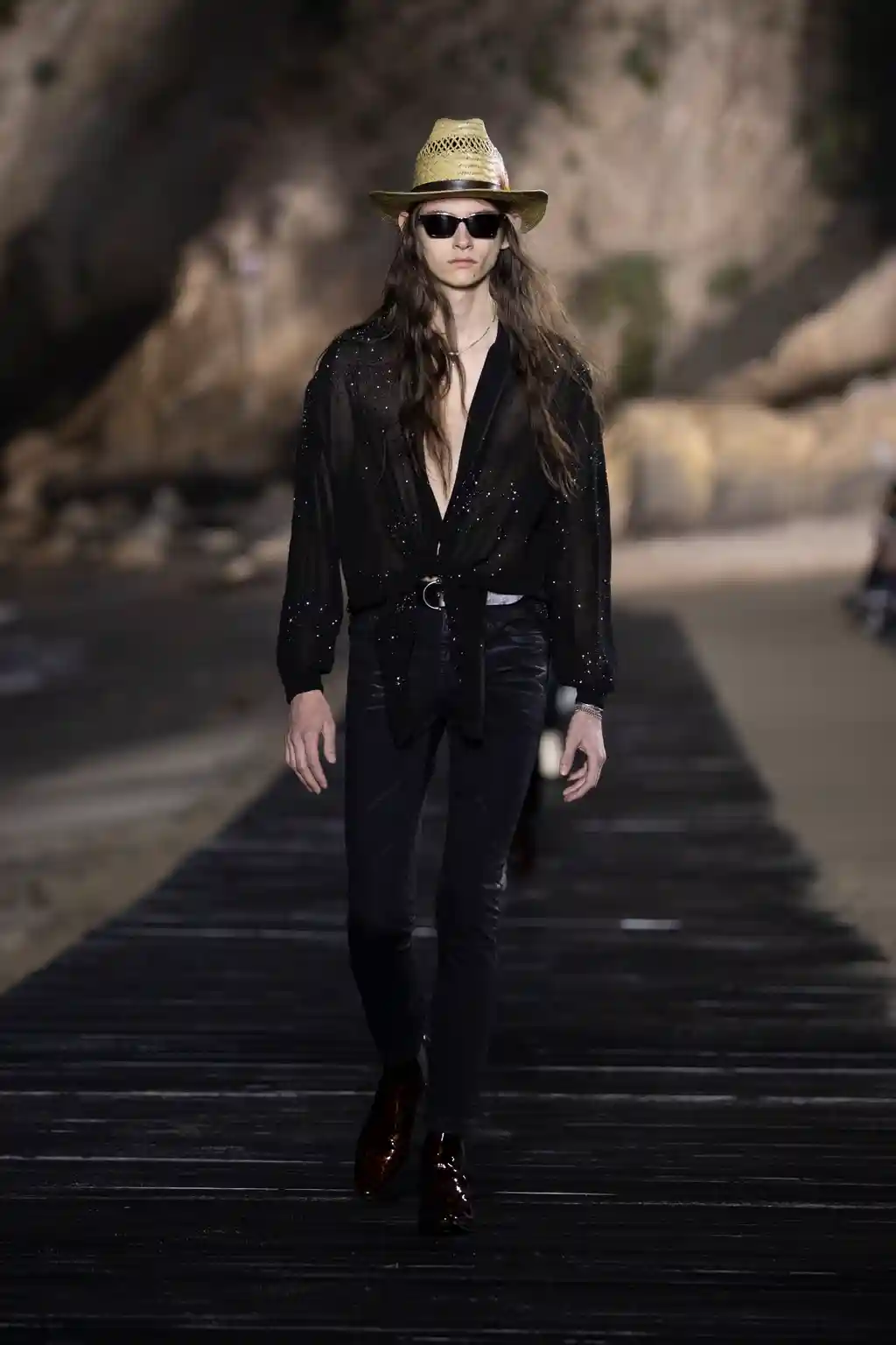 The looks were modelled by an army of Mick Jagger-esque boys, including Liam’s lookalike son, Lennon Gallagher. Unbuttoned shirts, trenchcoats paired with denim shorts and less-skinny, more-baggy style trousers all featured, in part inspired by Marrakech in the 1970s (thanks to a collection of photographs that Jagger showed Vaccarello of him holidaying in the capital of Morroco in the disco decade).