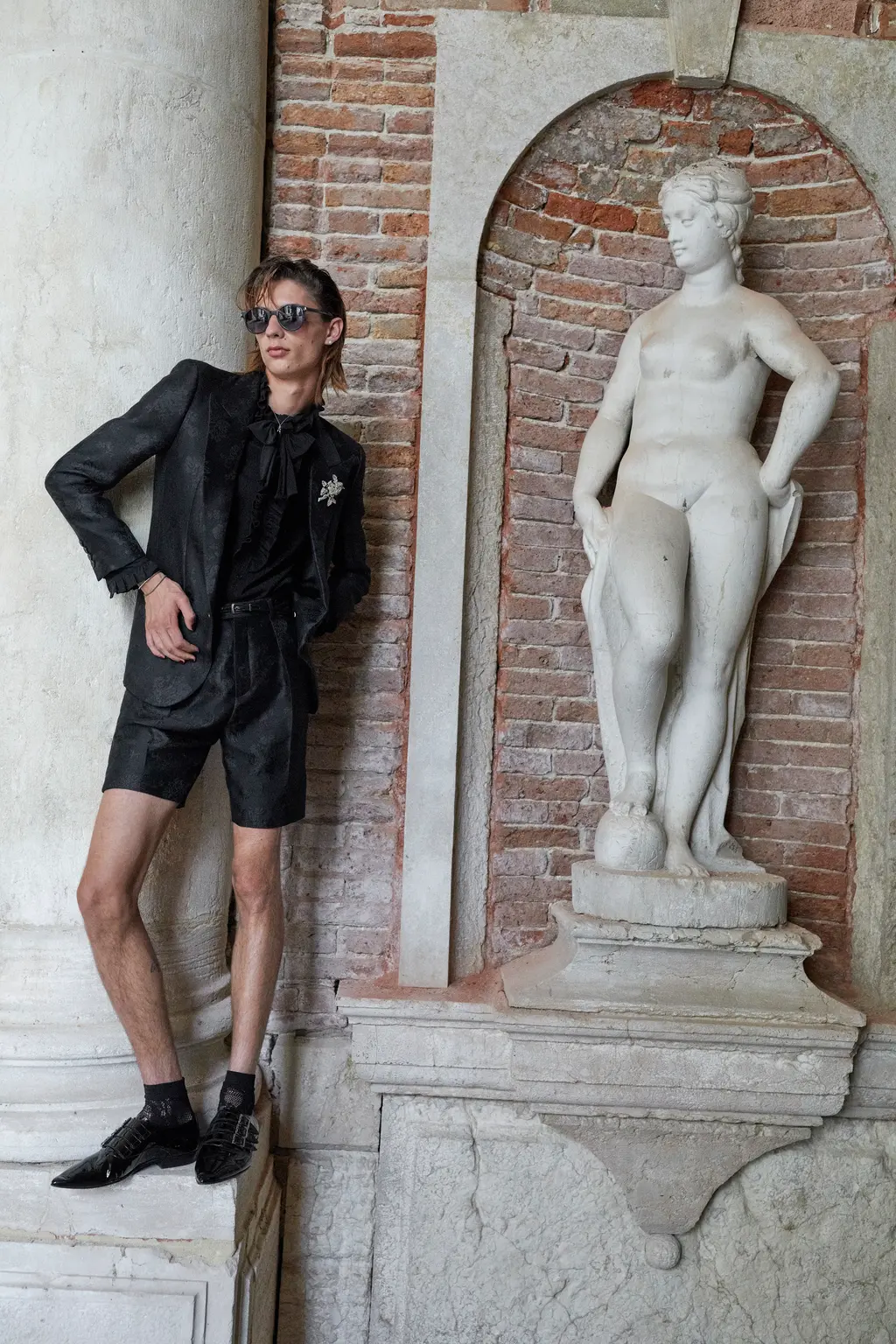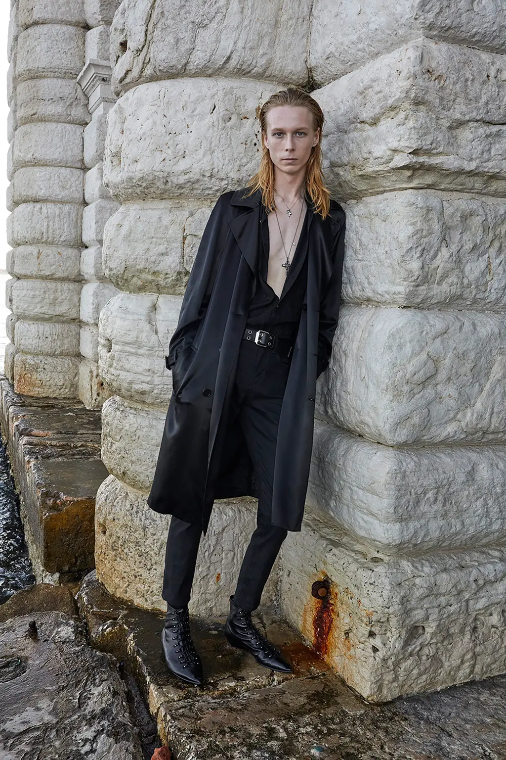 The show opened with a model walking on water. This was Vaccarello’s vision of a future world, where the Saint Laurent boys strode around botanics, their looks reflected on the installation’s mirrored surface. In Venezia, where the canal waters are impossibly blue and the city landscape deeply historic, the contrast between the old and new was present not only in the show’s setting, but in the collection, too.