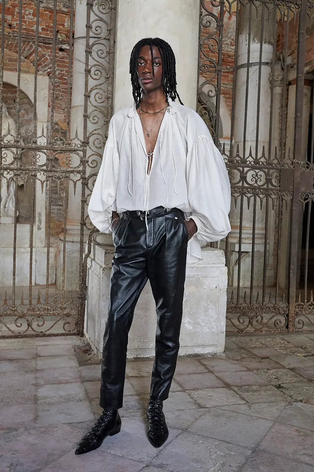 Striding like modern-day flaneurs, shirts with ruffled detailing were worn under razor-sharp blazers with shorts. And in a case for androgyny, necks were sliced far-south, revealing large portions of the chest. Better yet, lace detailing was intricate, poking out of shirt sleeves and covering the neck. Perhaps the best moment, though, was a cape. Secured at the neck, it appeared as an opulent evening coat from the back, albeit one that drags across the floor. From the front, it was a medieval statement.