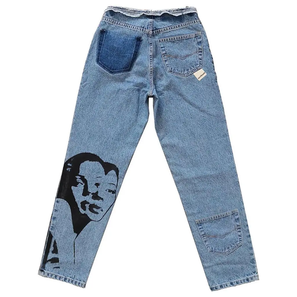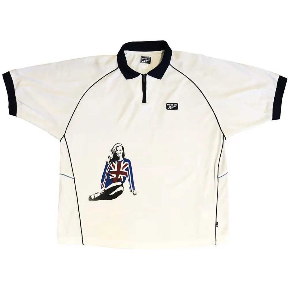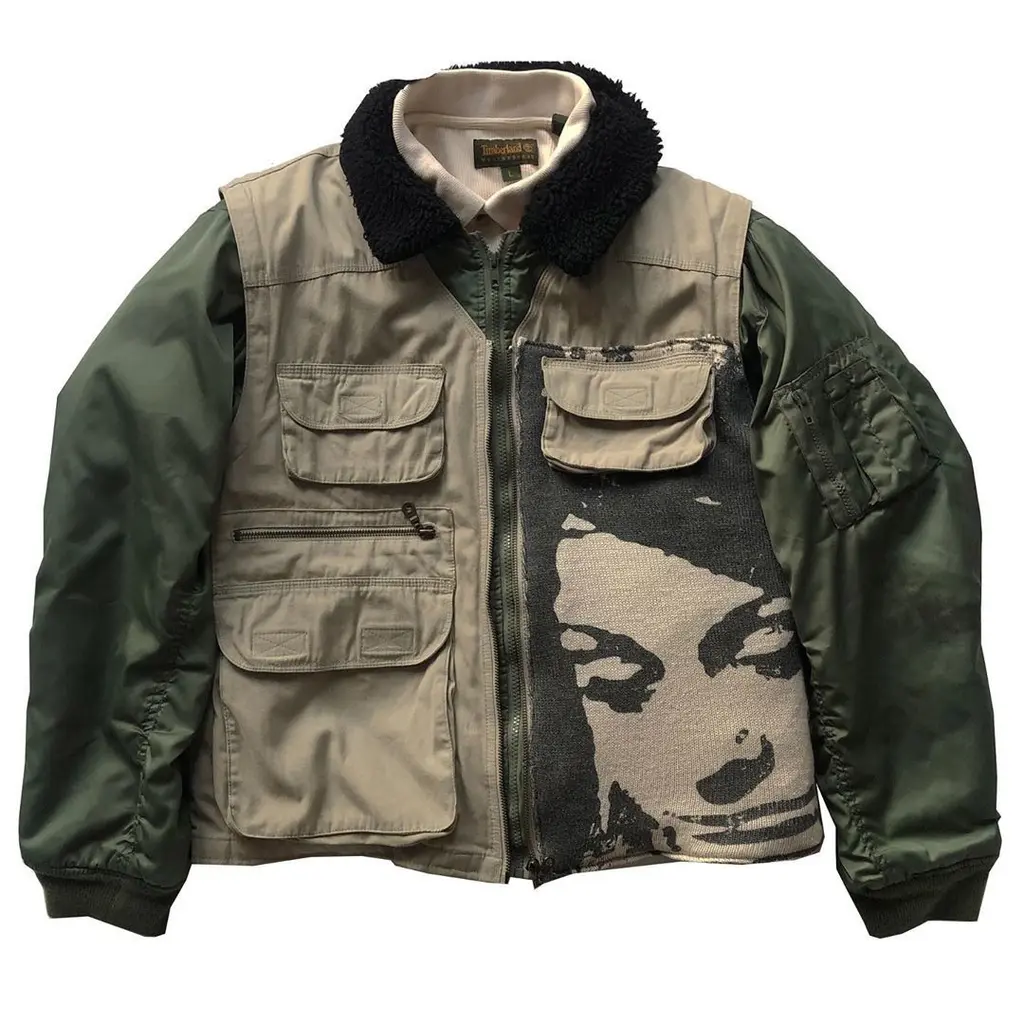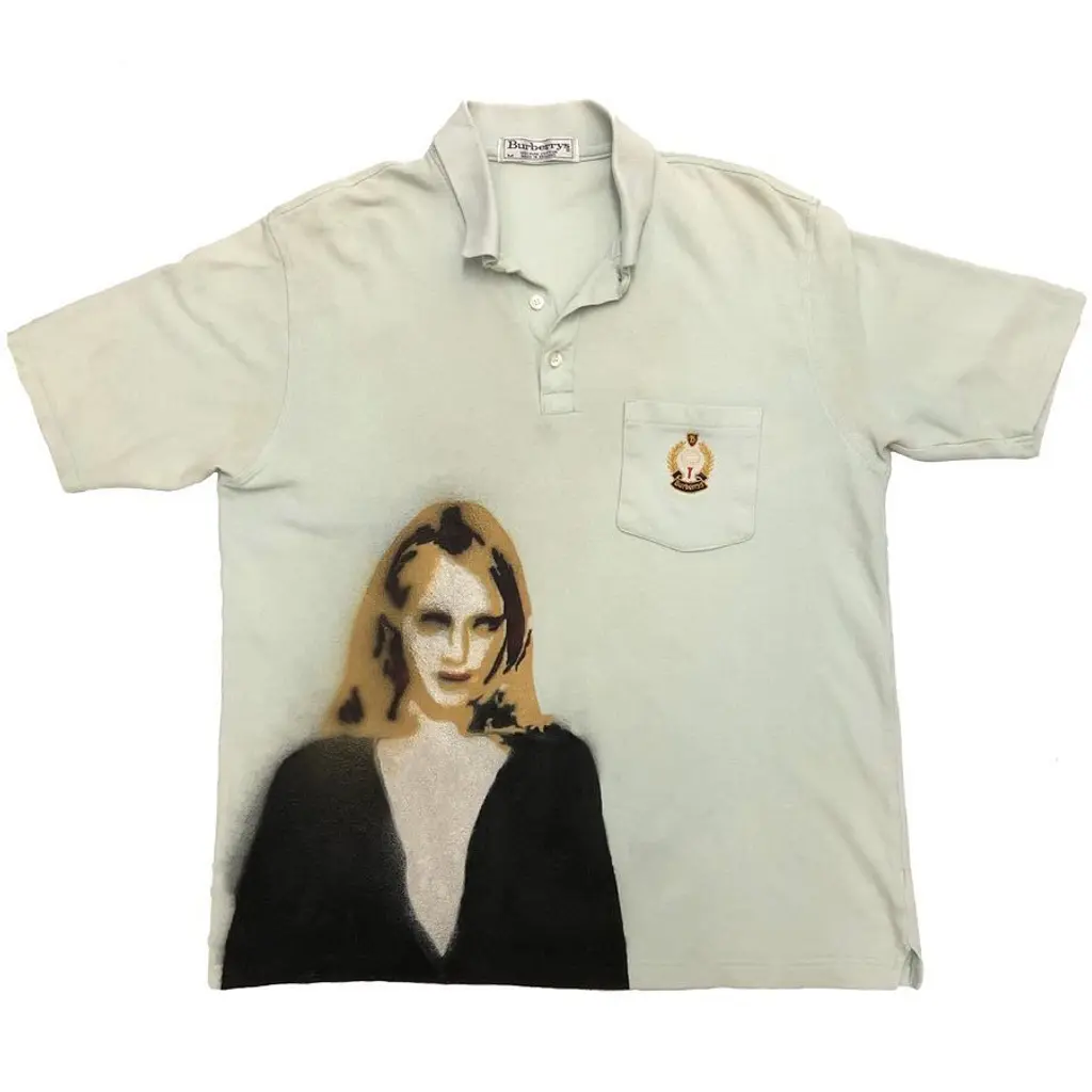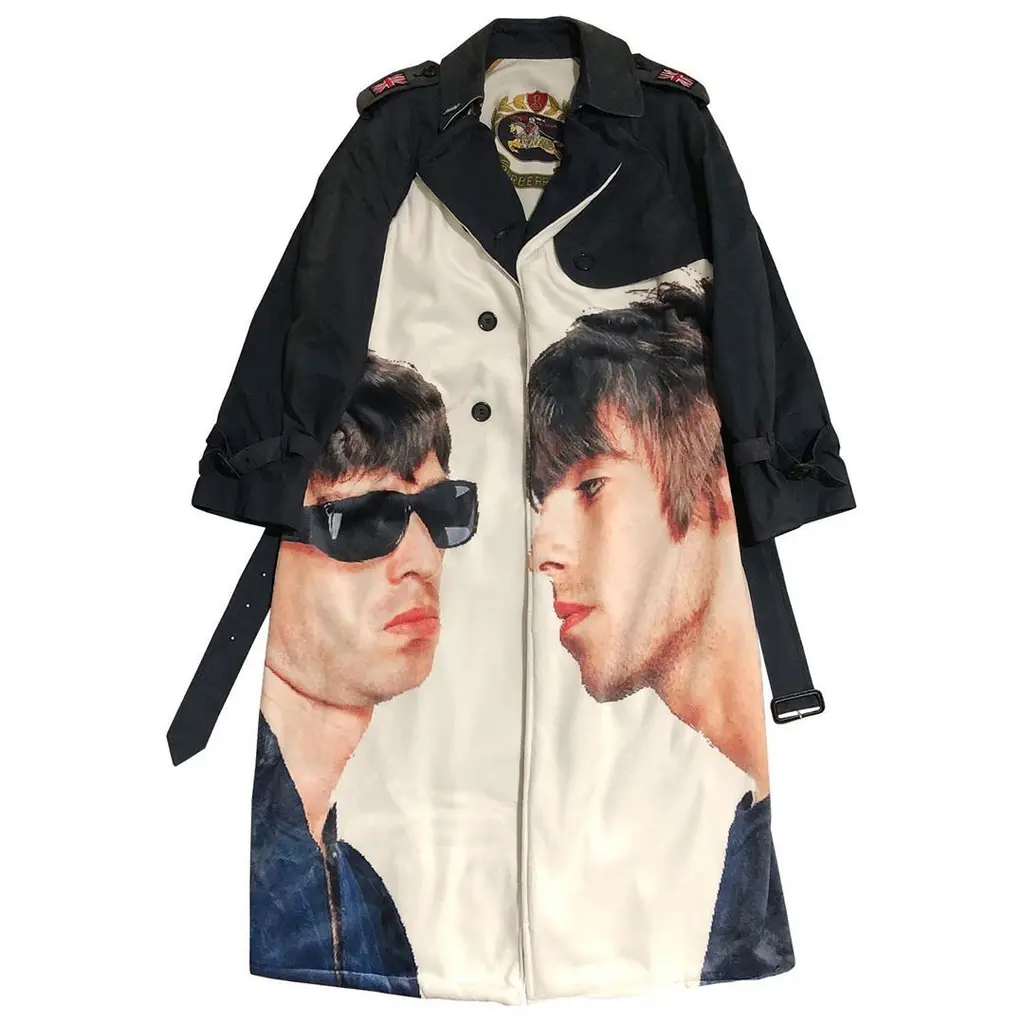 These days, he makes one-off pieces which he flogs on his Instagram account. His sustainably-minded garments include a second-hand Burberry trench with a print of Liam and Noel Gallagher slapped on the front, a layered, reworked utilitarian jacket, and a zipped Reebok polo top with a picture of Kate Moss wearing a Union Jack jumper on the corner – a spin on the sports casuals style made famous by footie hooligans in his hometown.