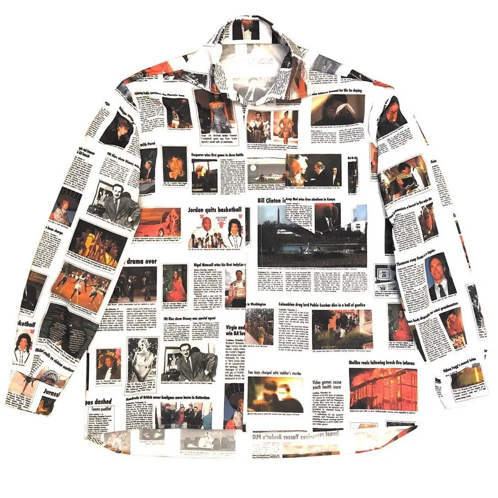 With a nod to British design by way of influences like Vivienne Westwood’s anarchic, deconstructed styles of the early 1990s and the prints on New Order’s official merchandise, Nowell channels wider references like docu-photographer Martin Parr’s satirical lens into everyday British life. Similarly, he admits flicking through old issues of The Face (wahey!), appreciating Britpop’s response to the Americanisation of British culture in the mid-’90s.