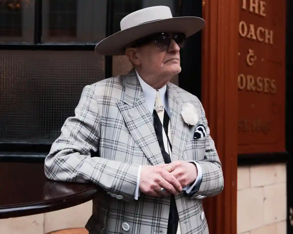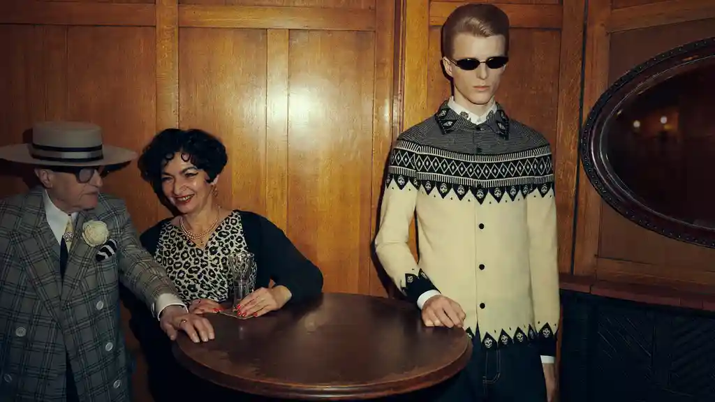 Now, Seán’s got his sights set on London’s Soho. For his pre-AW25 collection, the designer enlisted two local legends and permanent fixtures of the area’s cobbled streets: George “Soho George” Skeggs and jazz musician Florence Joelle. Naturally, the campaign was shot inside the landmark The Coach and Horses pub (by Theo Sion), but that’s not all. A limited run of 100 T‑shirts slapped with George and Florence’s faces lands today, which is the perfect excuse for Séan to tell us six things about the new collection and his pub order. Why six? Well, why not six?