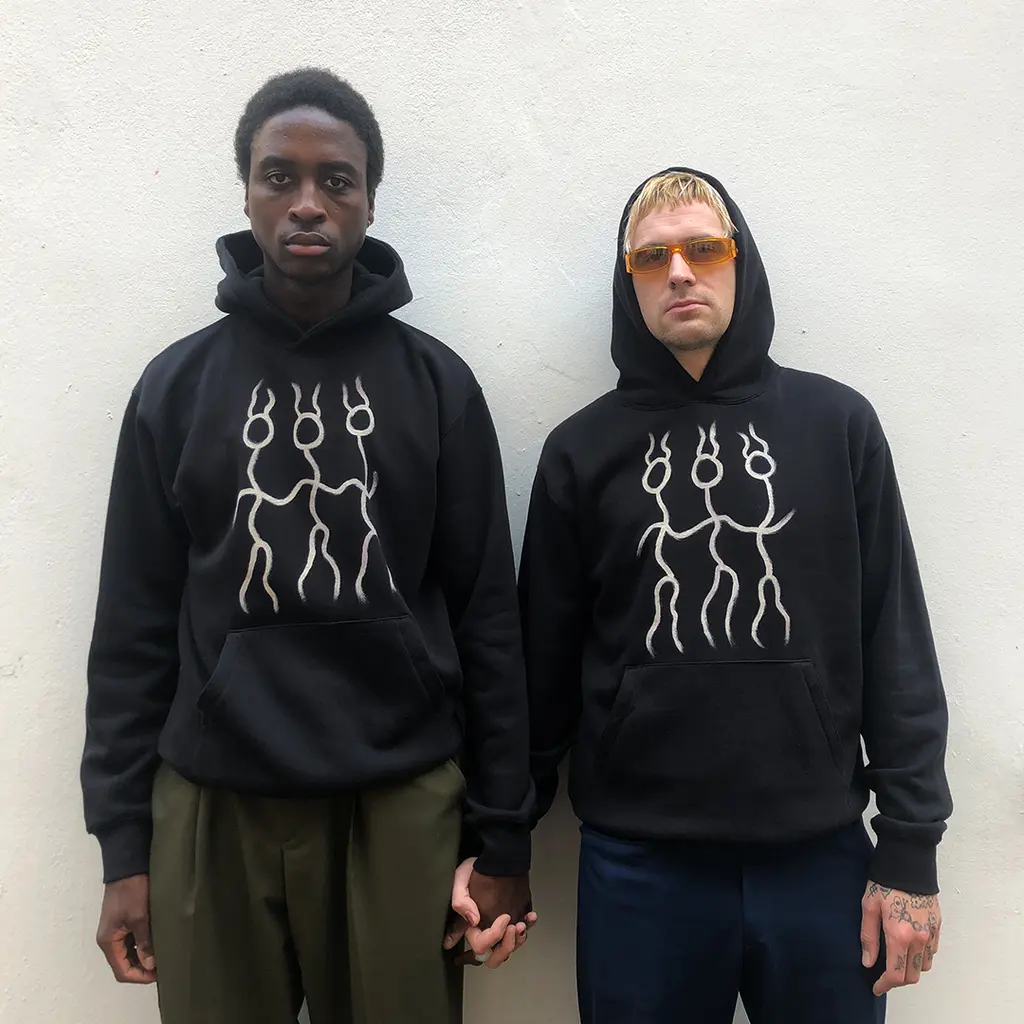 The brand is rooted in Monaghan’s early obsessions with hardcore punk and heavy metal, shown through his latest design that sees dancing demons sprawled across it. Being at school, he found himself not fitting in so much with what the other kids were into. Pop and all that. So he started going to shows, which exposed him to a feeling of togetherness, adopting a DIY mentality that he still puts into practice today.