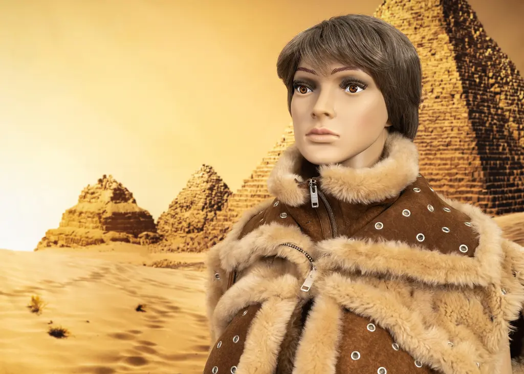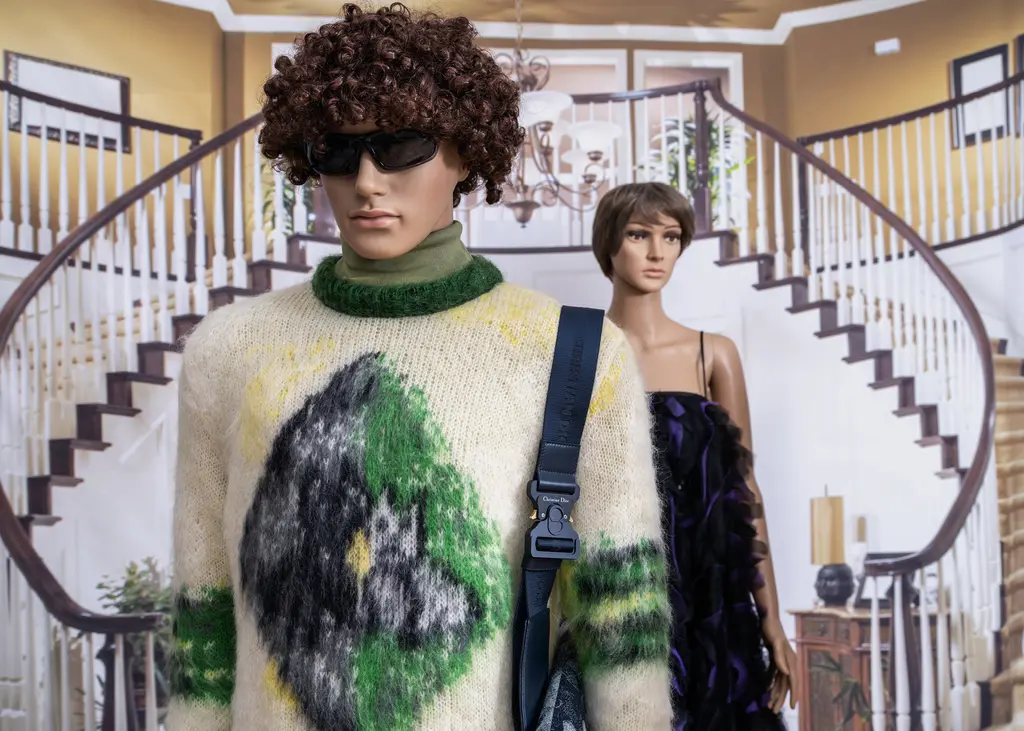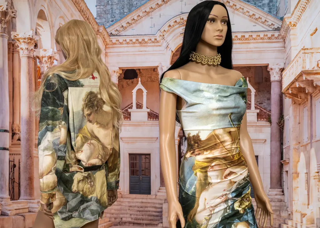 The scenes he created are weird, with mannequins in blonde wigs standing by a hospital bed, or cheesy postcard photos by the Egyptian pyramids. Then, the mannequins take on a day-to-day life at home, standing by the garden wearing plush purple Blumarine, or clutching a Dior bag by a huge stately staircase. They’re even into architecture, scoping Rome’s Trevi Fountain while wearing archive Vivienne Westwood that’s printed with Renaissance paintings.