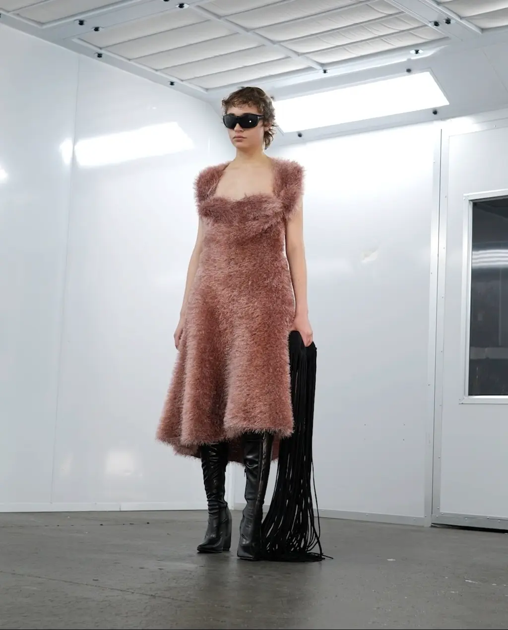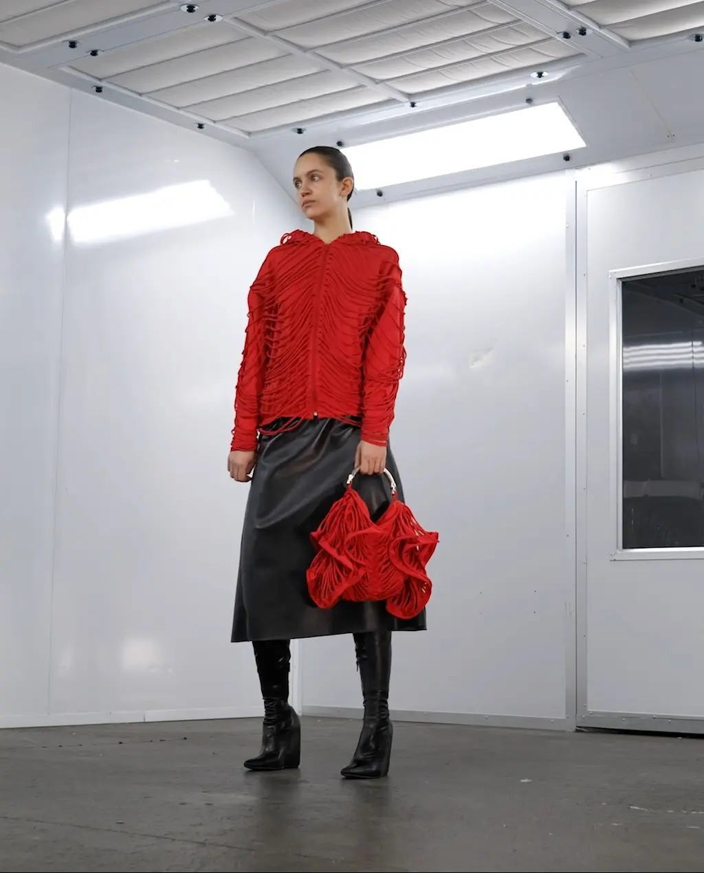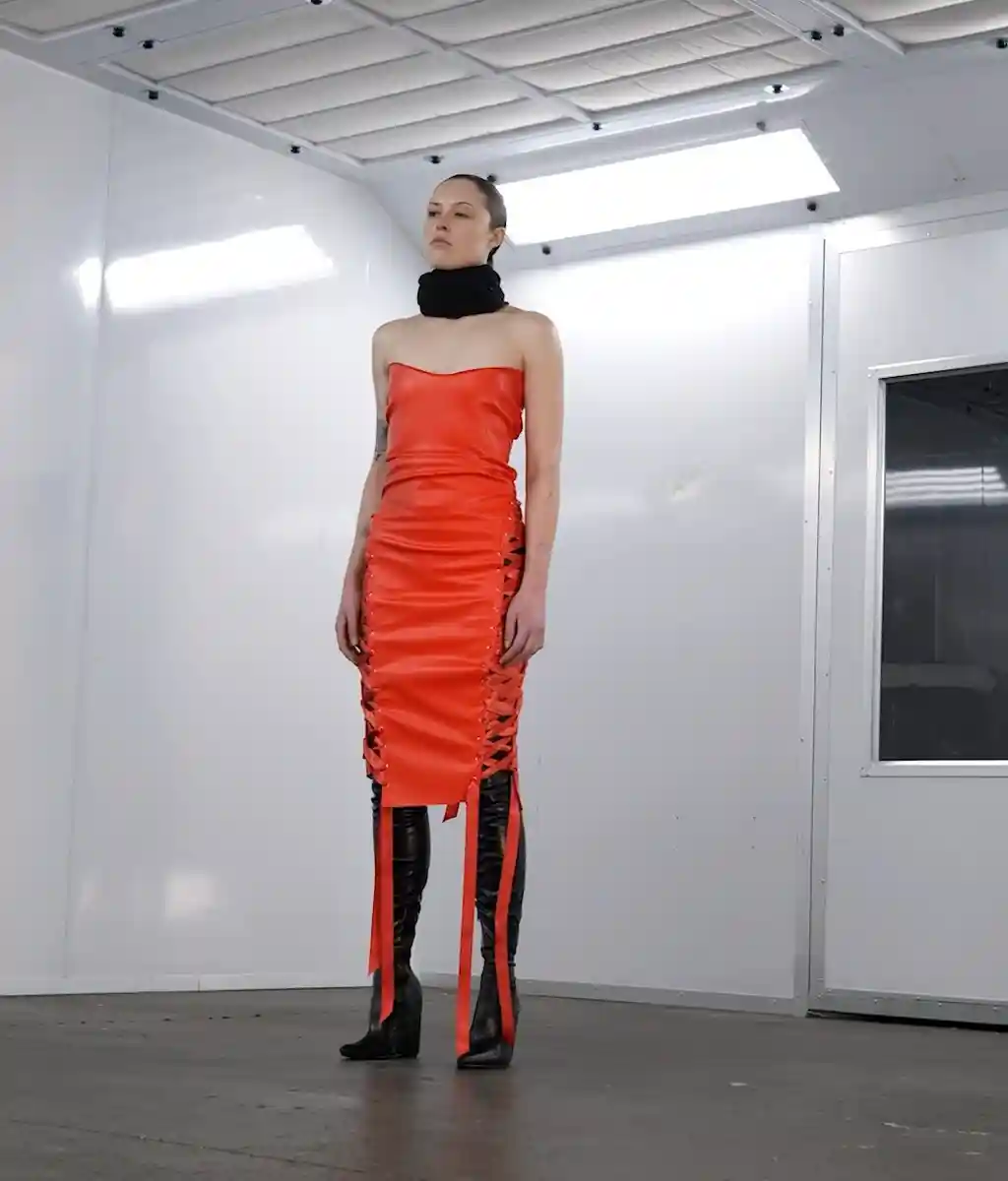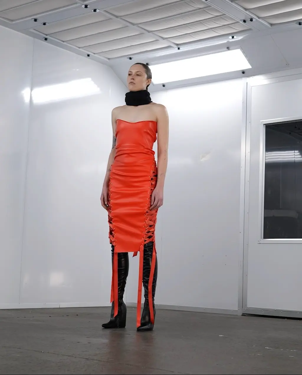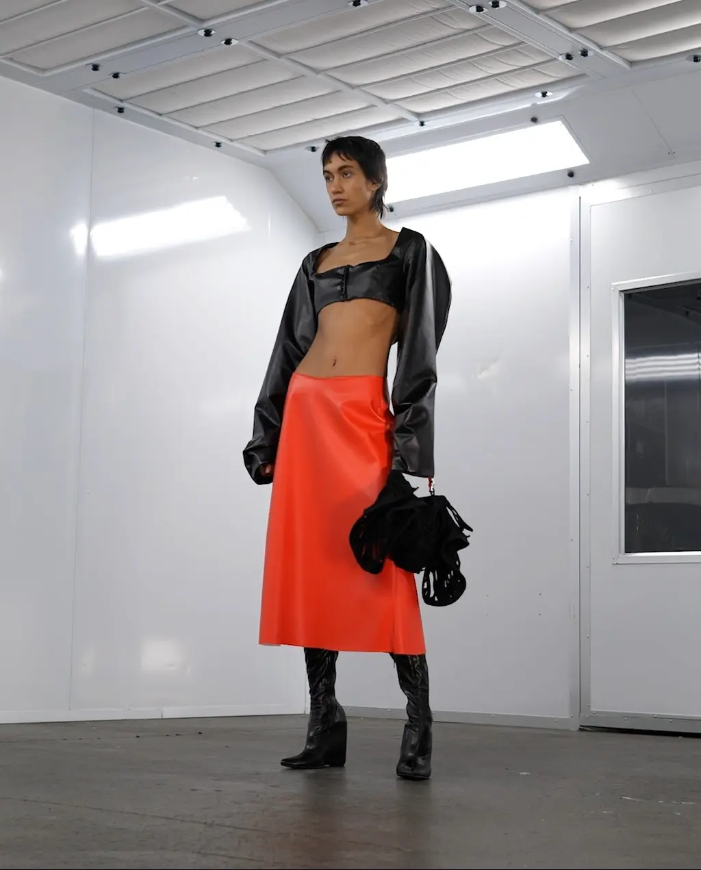 Her designs play with sizing and measurements, , like obnoxious structuring on an oversized orange leather jacket, and the Fox-favourite crop top in its minuscule proportion. She utilises fabrics and finishings like vinyl, faux fur and lace-up ties to turn a simple silhouette into a hell-raising statement. “I think you can’t help but be influenced by who you were,” she says. “I definitely embrace that slightly awkward tall girl I used to be, but I celebrate the woman I have become.”